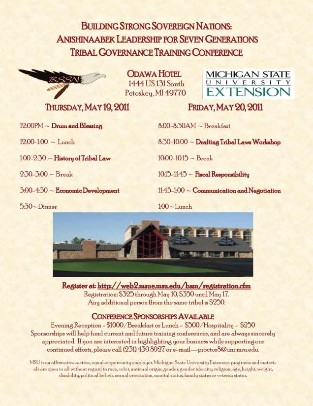 The Building Strong Sovereign Nations Tribal Governance Training Conference is quickly approaching. It’s happening on May 19th and 20th at the Odawa Casino Resort in Petoskey. Here’s a link to the registration page.