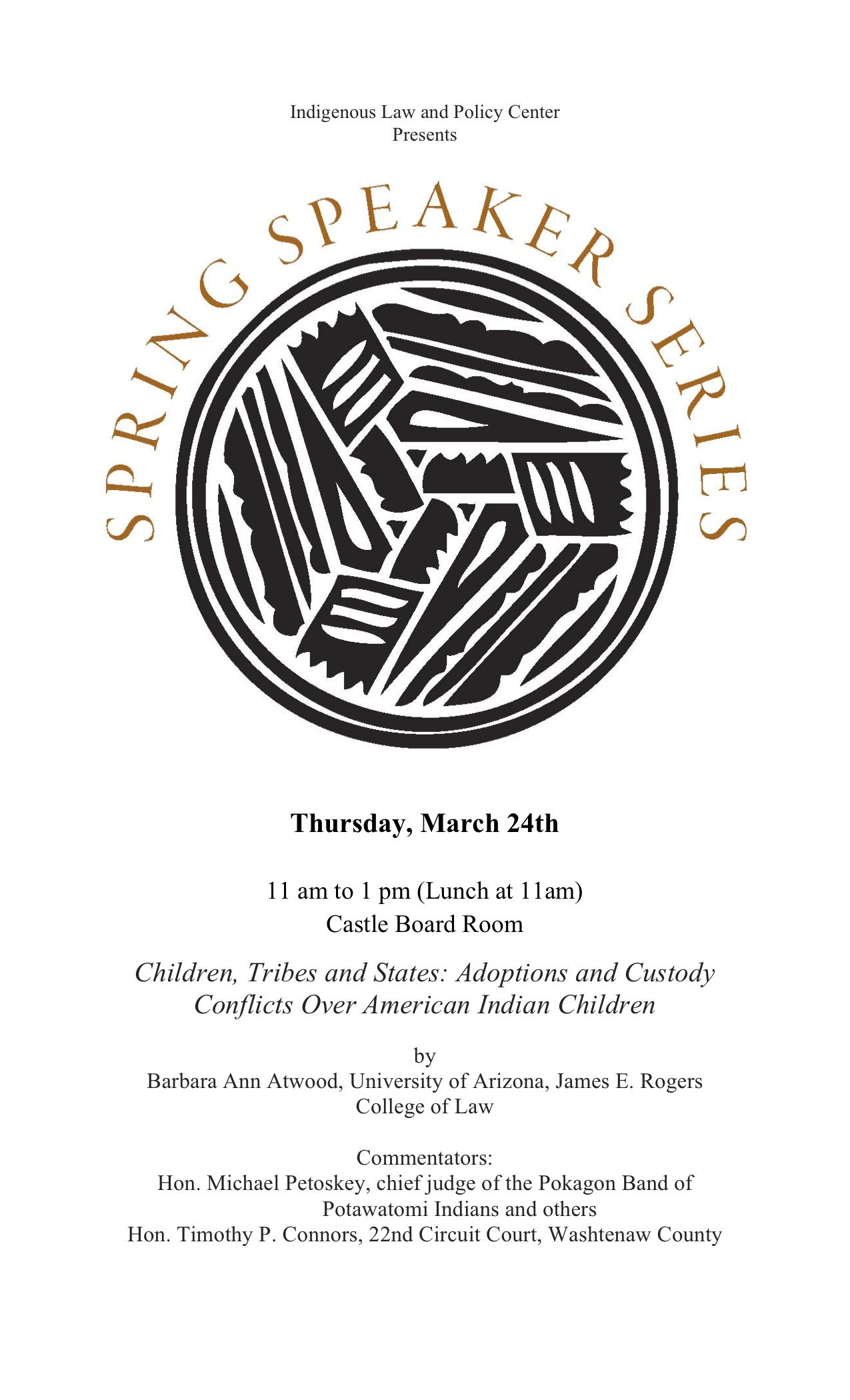 Please join us for our third event in our Spring Speakers Series, a discussion with Prof. Barbara Atwood, author of Children, Tribes and States: Adoptions and Custody Conflicts Over American Indian Children. The Honorable Michael Petoskey and the Honorable Timothy Connors will be commenting on the book. The event will start at 11am with lunch in the Castle Board Room, and end by 1pm. No registration is necessary.