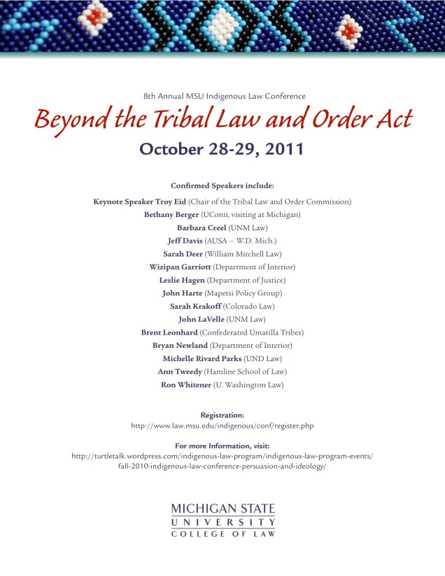 Save the Date–ILPC 8th Annual Conference on the Tribal Law and Order Act September 12, 2011September 13, 2011Kate Fort For information, see here. Registration, see here. Click to print (Opens in new window) Print Click to email a link to a friend (Opens in new window) Email Click to share on X (Opens in new window) X Click to share on Facebook (Opens in new window) Facebook More Click to share on Pinterest (Opens in new window) Pinterest Click to share on Tumblr (Opens in new window) Tumblr Click to share on Reddit (Opens in new window) Reddit Like Loading... Related