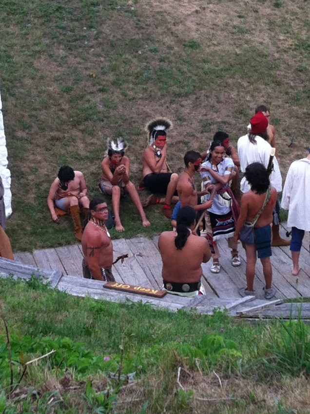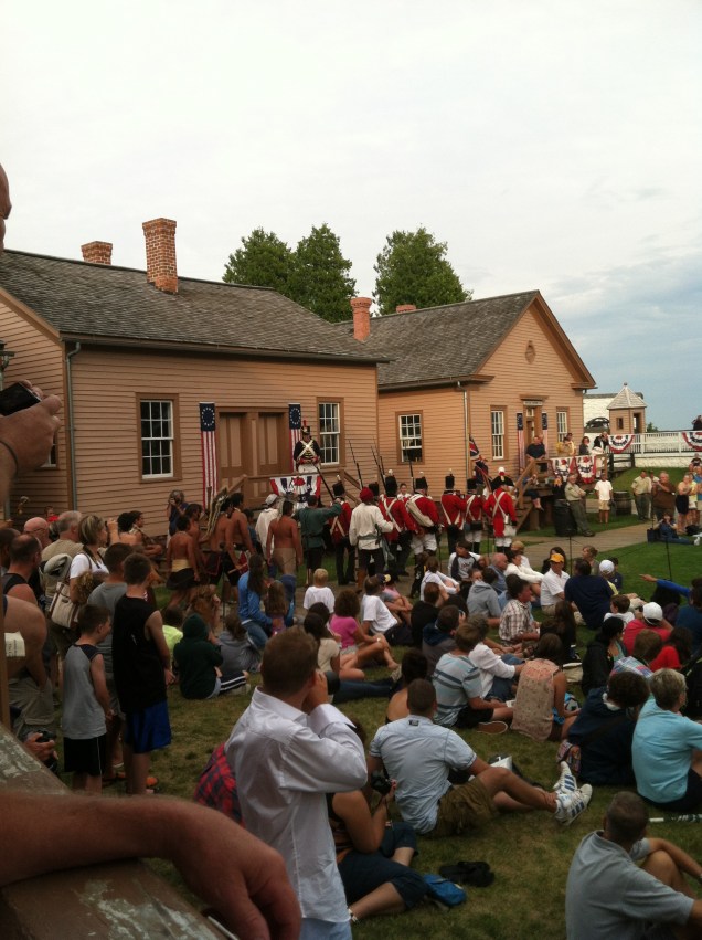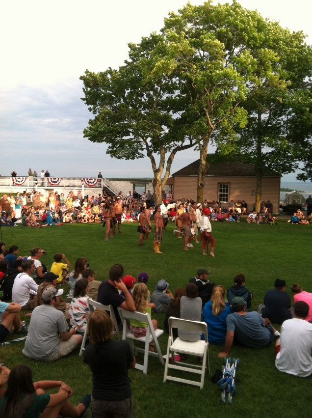 Yesterday, we traveled to Mackinac Island (Turtle Island) to view the reenactment of the opening “battle” of the War of 1812, where a group of several hundred Indians, British veterans (described as victims of “unconquerable drunkenness”), and French voyageurs (many not wearing any shoes), took the fort from the Americans without a shot. It is true that the terror of seeing hundreds of Indians in the woods outside the fort forced the Americans to surrender quickly.