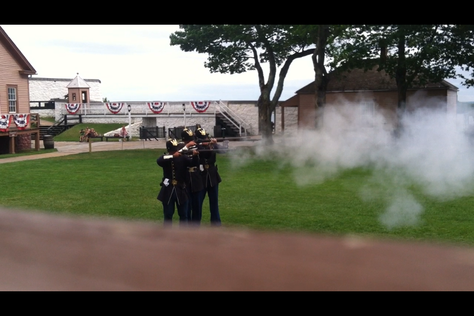 The attackers entering the fort following the Americans’ indication of willingness to surrender (no one told them that the war had started, to their credit). Those British red coats really were as old as they look here.