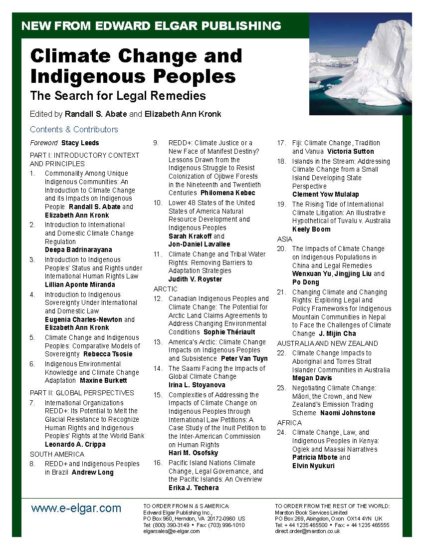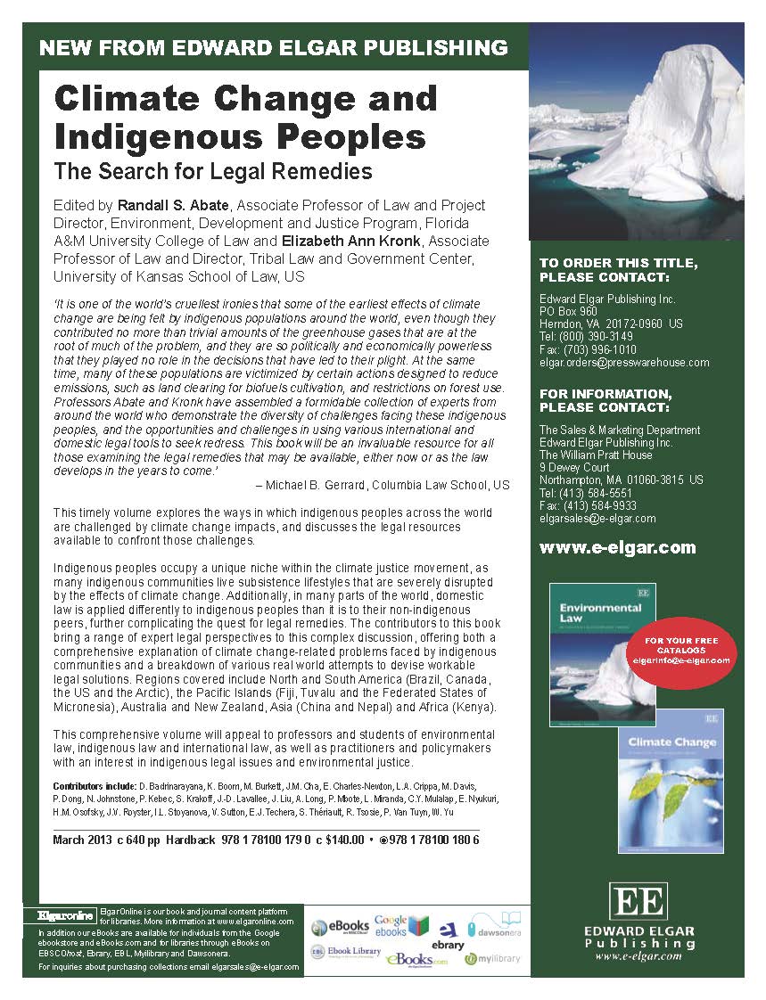 Forthcoming Book Announcement: “Climate Change and Indigenous Peoples” (Abate & Kronk, eds.) October 16, 2012Matthew L.M. Fletcher Flyer here: Abate & Kronk – Flyer for North and South America – Aug. 12 Click to print (Opens in new window) Print Click to email a link to a friend (Opens in new window) Email Click to share on X (Opens in new window) X Click to share on Facebook (Opens in new window) Facebook More Click to share on Pinterest (Opens in new window) Pinterest Click to share on Tumblr (Opens in new window) Tumblr Click to share on Reddit (Opens in new window) Reddit Like Loading... Related