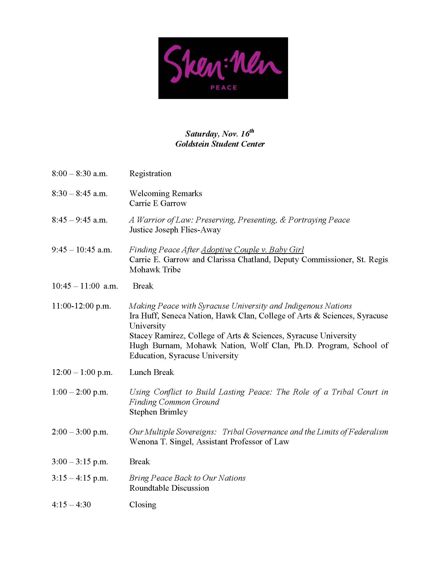 The Haudenosaunee teach that peace is not the absence of war, but rather is an active striving towards universal justice. Today, the Haudenosaunee and many other indigenous peoples are striving to create their version of peace in a world that is often hostile to indigenous sovereignty, illustrated by the land claim legal battles, interference in border crossing rights, and the Adoptive Couple v. Baby Girl case, to name just a few examples. Yet despite these constant battles indigenous peoples continue to strive for a society that creates peace or universal justice. The 10th Haudenosaunee conference brings together speakers and participants to discuss and share ideas about how they view peace and the means they use to achieve that peace.