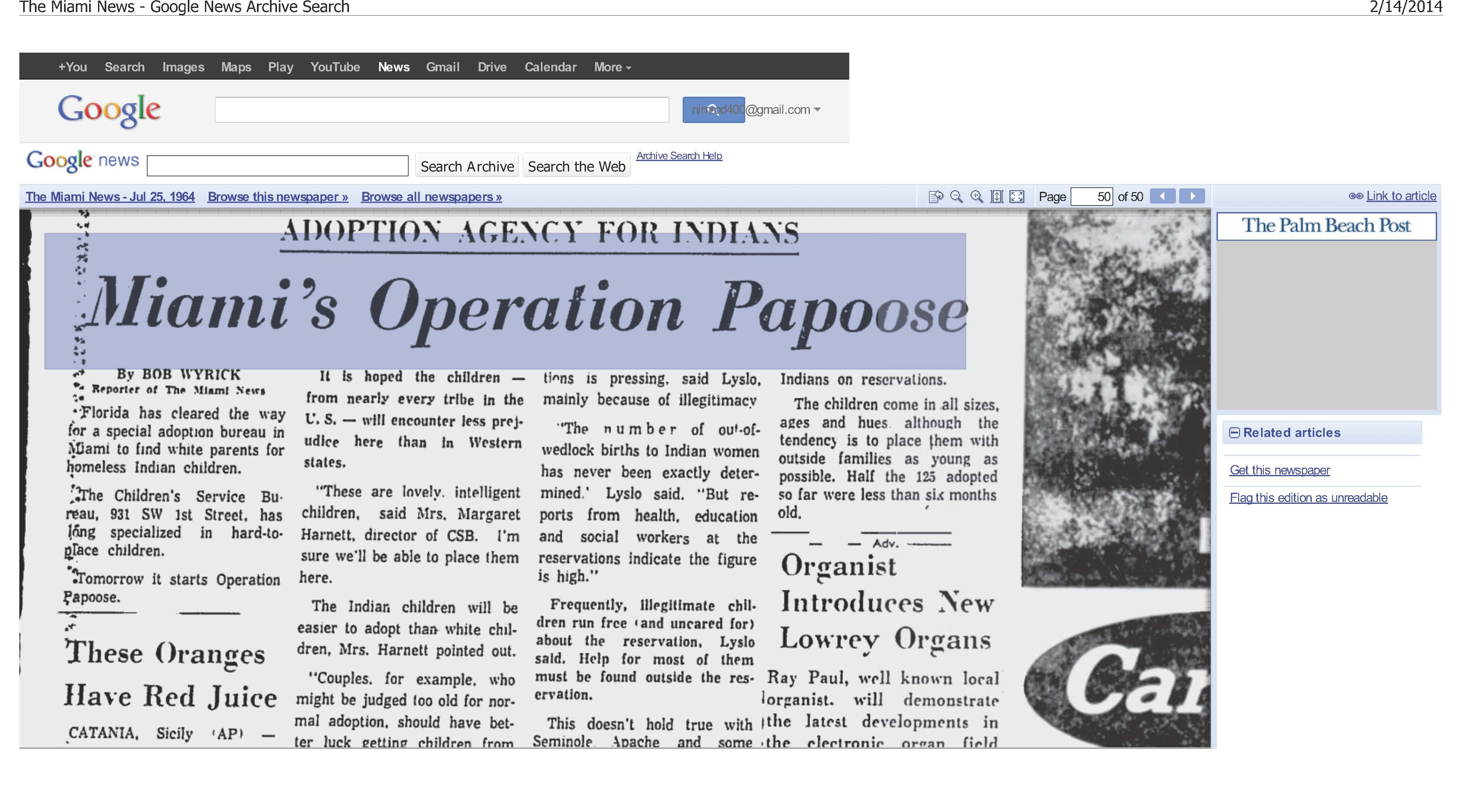American Indian Child Welfare History — Florida’s “Operation Papoose” (1964) February 15, 2014February 14, 2014Matthew L.M. Fletcher Designed to find white families for Indian kids: Click to print (Opens in new window) Print Click to email a link to a friend (Opens in new window) Email Click to share on X (Opens in new window) X Click to share on Facebook (Opens in new window) Facebook More Click to share on Pinterest (Opens in new window) Pinterest Click to share on Tumblr (Opens in new window) Tumblr Click to share on Reddit (Opens in new window) Reddit Like Loading... Related