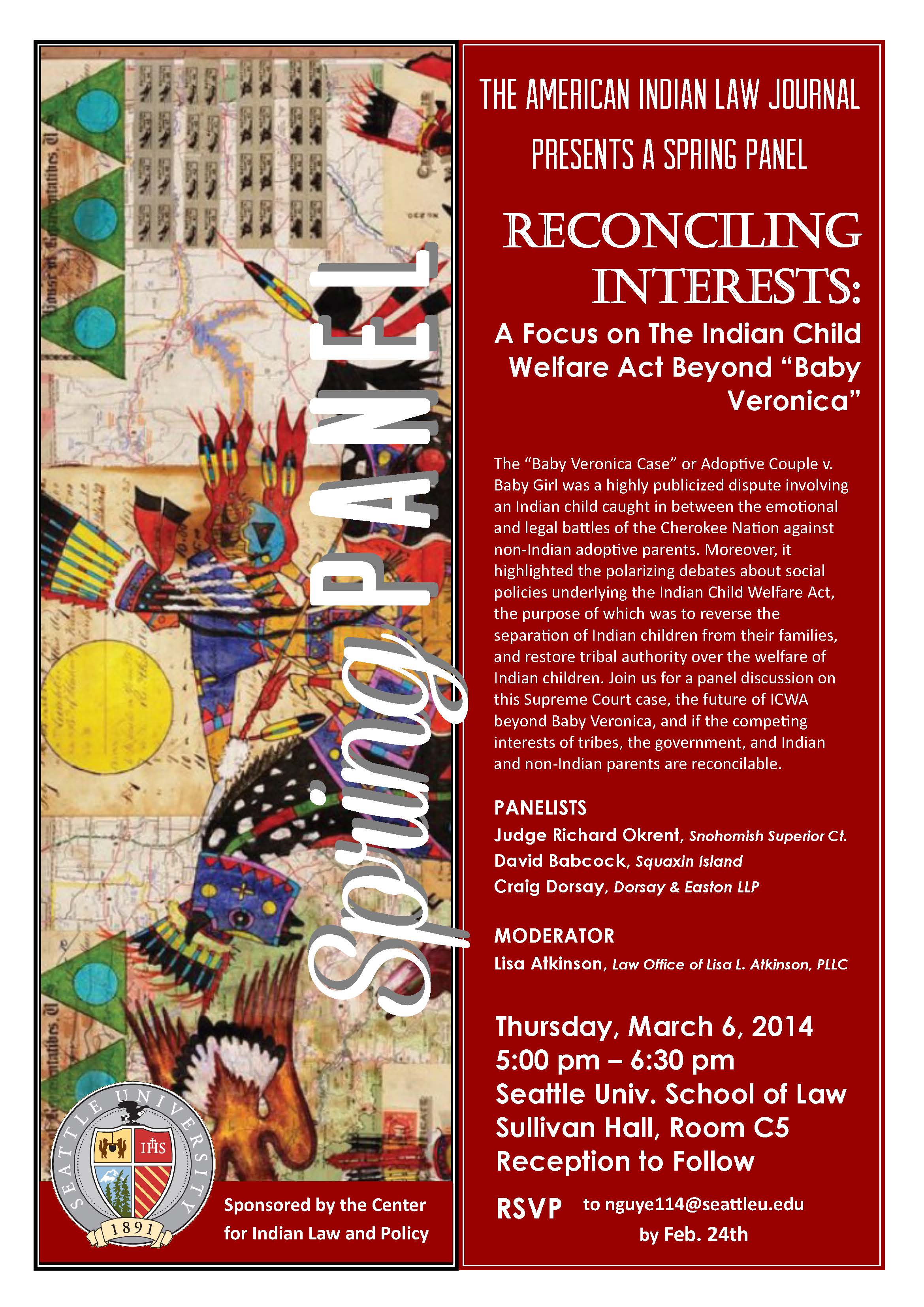 The “Baby Veronica Case” or Adoptive Couple v. Baby Girl was a highly publicized dispute involving an Indian child caught in between the emotional and legal battles of the Cherokee Nation against non-Indian adoptive parents. Moreover, it highlighted the polarizing debates about social policies underlying the Indian Child Welfare Act, the purpose of which was to reverse the separation of Indian children from their families, and restore tribal authority over the welfare of Indian children. Join us for a panel discussion on this Supreme Court case, the future of ICWA beyond Baby Veronica, and if the competing interests of tribes, the government, and Indian and non-Indian parents are reconcilable.