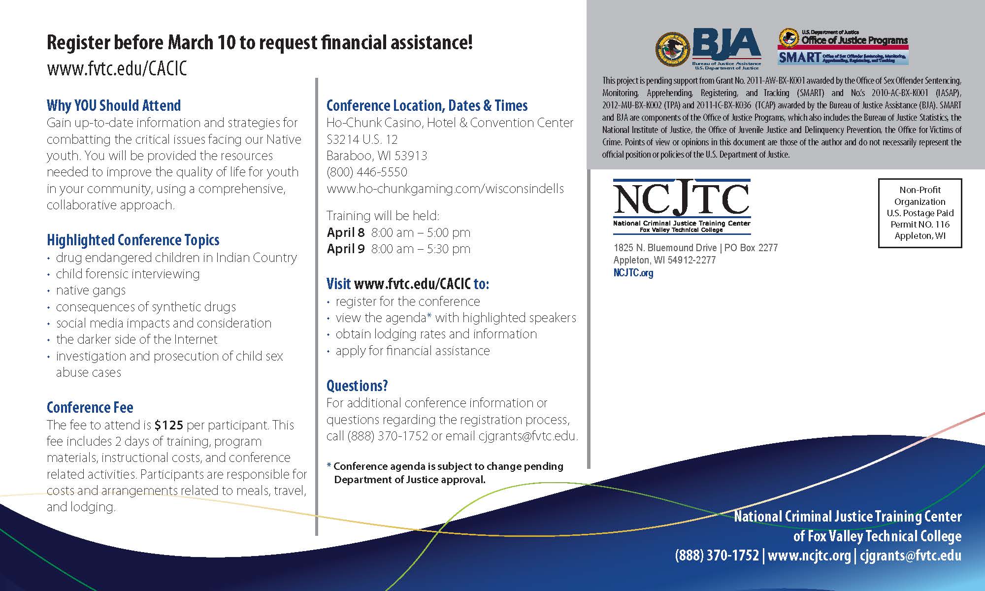 9th Annual Crimes Against Children in Indian Country Conference — April 8-9, 2014 March 8, 2014March 7, 2014Matthew L.M. Fletcher Here: Click to print (Opens in new window) Print Click to email a link to a friend (Opens in new window) Email Click to share on X (Opens in new window) X Click to share on Facebook (Opens in new window) Facebook More Click to share on Pinterest (Opens in new window) Pinterest Click to share on Tumblr (Opens in new window) Tumblr Click to share on Reddit (Opens in new window) Reddit Like Loading... Related