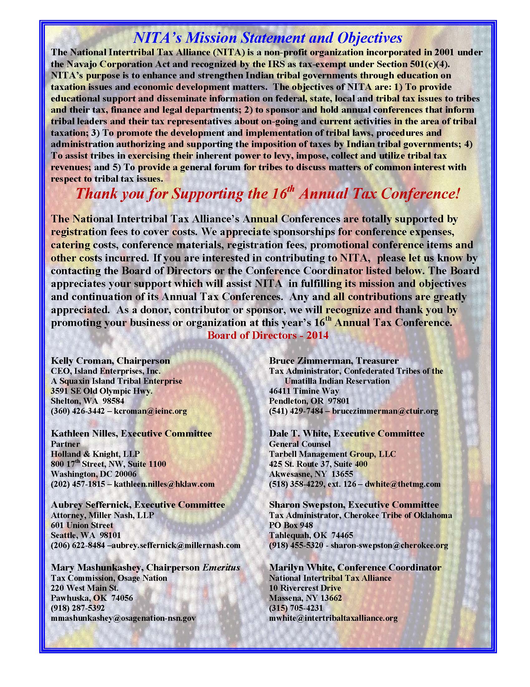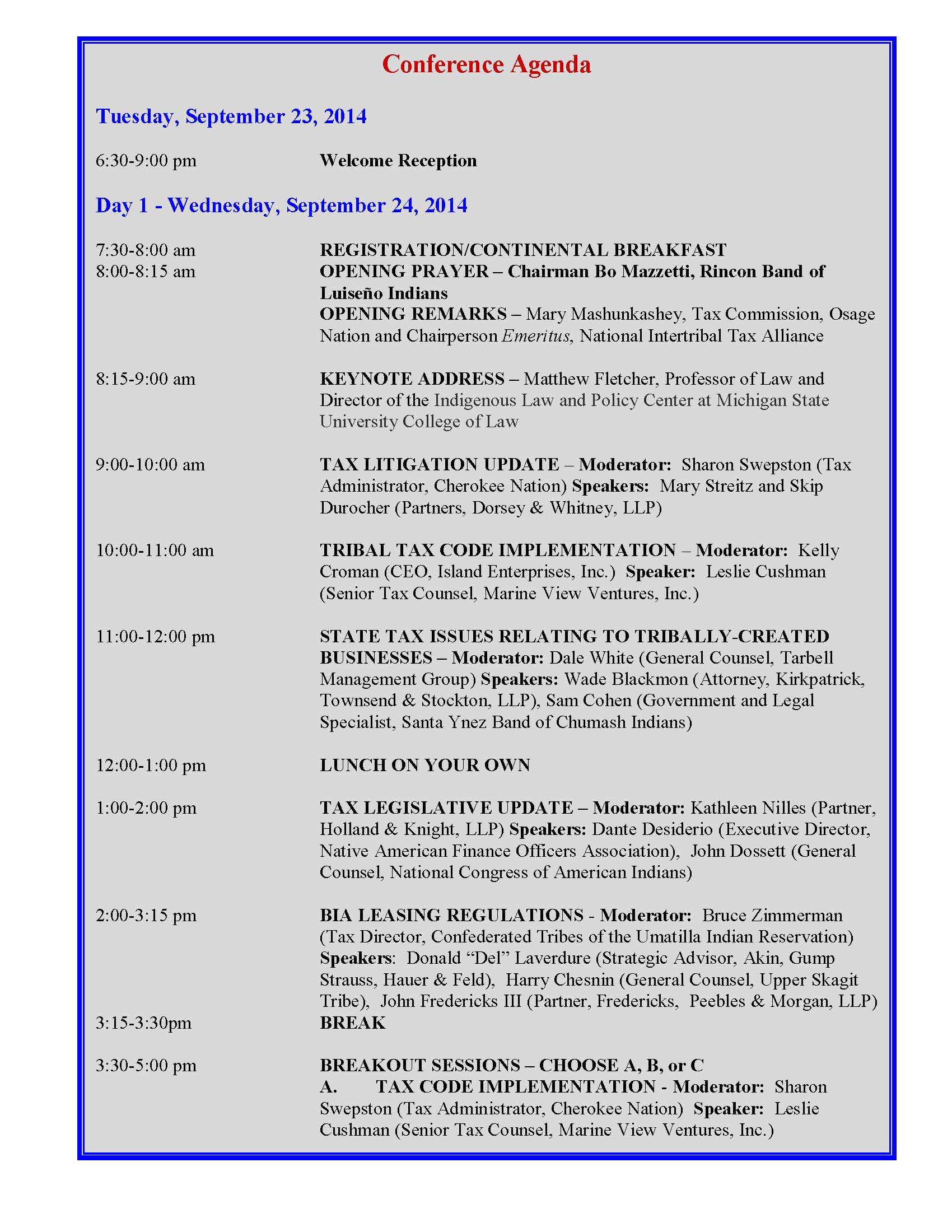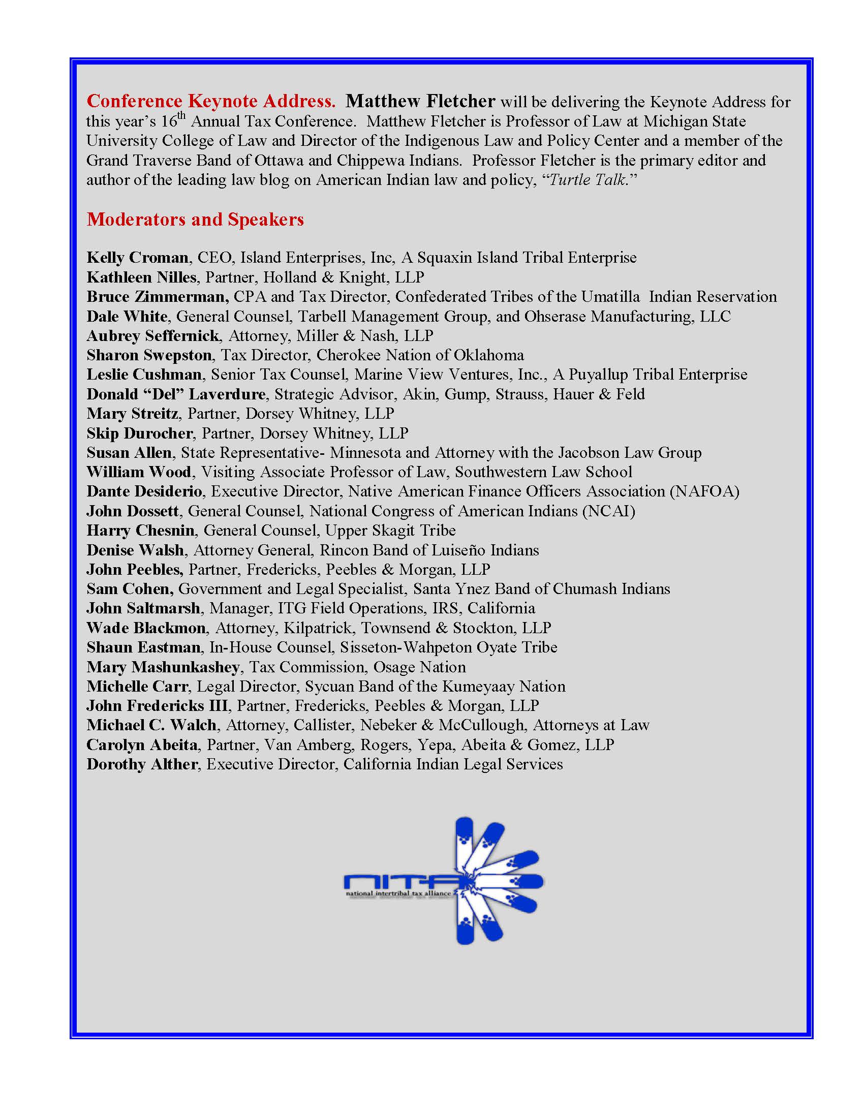NITA Annual Conference Brochure — Sept. 24-25, 2014 June 5, 2014Matthew L.M. Fletcher Here, with agenda, (PDF): Print (Opens in new window) Print Email a link to a friend (Opens in new window) Email Share on X (Opens in new window) X Share on Facebook (Opens in new window) Facebook More Share on Pinterest (Opens in new window) Pinterest Share on Tumblr (Opens in new window) Tumblr Share on Reddit (Opens in new window) Reddit Like Loading... Related