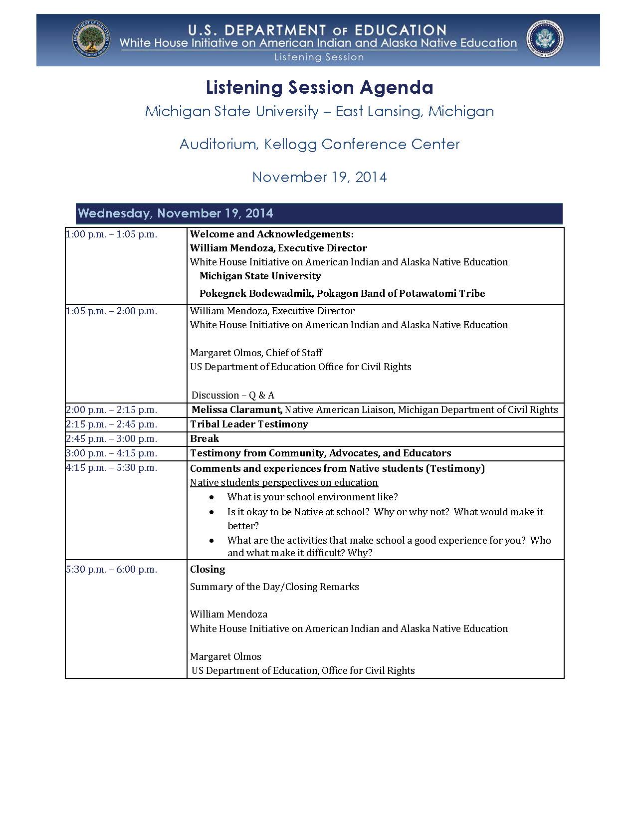Agenda for Dept. of Education School Environment Listening Tour for Native American Students — Nov. 19, 2014 November 19, 2014November 20, 2014Matthew L.M. Fletcher Here (PDF): Click to print (Opens in new window) Print Click to email a link to a friend (Opens in new window) Email Click to share on X (Opens in new window) X Click to share on Facebook (Opens in new window) Facebook More Click to share on Pinterest (Opens in new window) Pinterest Click to share on Tumblr (Opens in new window) Tumblr Click to share on Reddit (Opens in new window) Reddit Like Loading... Related