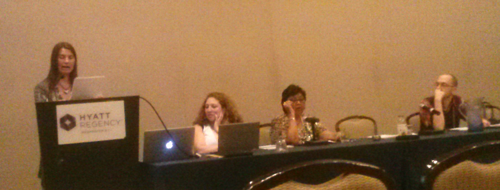 This was an extremely interesting panel held Saturday afternoon on LGBT issues and Ecoerotics in Native communities and oral history. At the podium is Melissa K. Nelson from SFSU, and left to right are moderator and discussant Mishuana Goeman from UCLA, Jennifer Denetdale from UNM, and Mark Rifkin from UNC Greensboro.