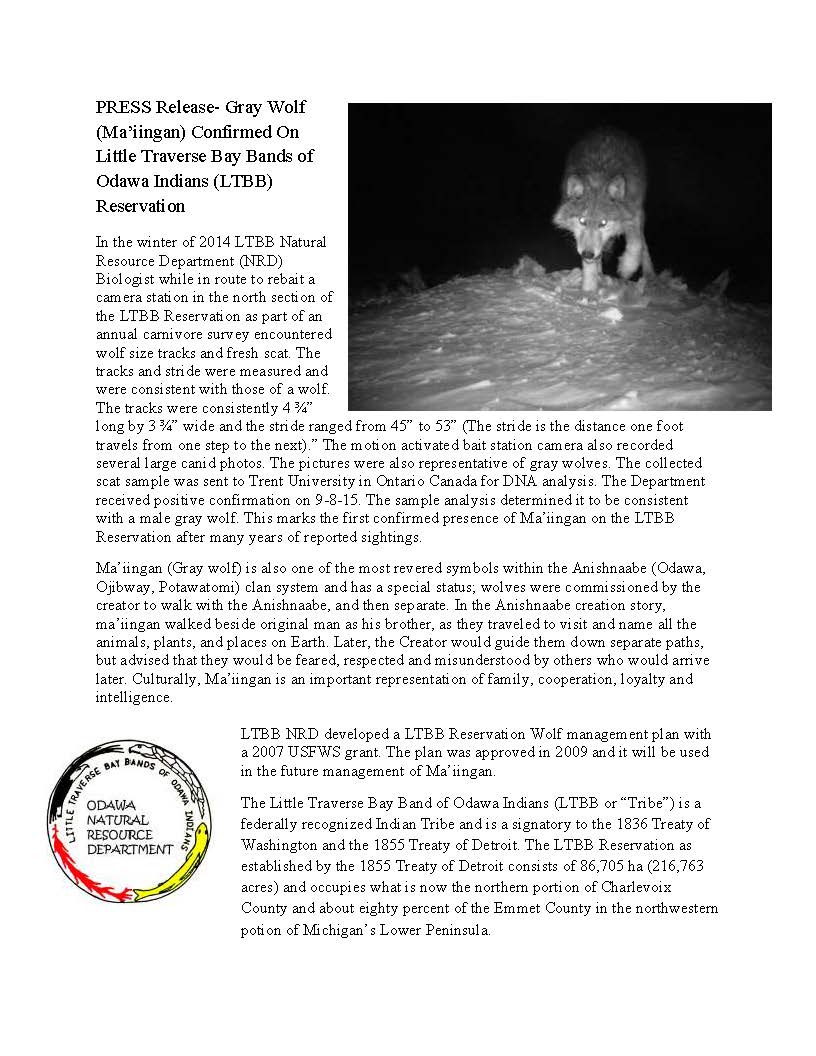 “Confirmed gray wolf on Little Traverse Bay Bands of Odawa Indians Reservation” September 16, 2015Matthew L.M. Fletcher Here. From the tribe’s site: Click to print (Opens in new window) Print Click to email a link to a friend (Opens in new window) Email Click to share on X (Opens in new window) X Click to share on Facebook (Opens in new window) Facebook More Click to share on Pinterest (Opens in new window) Pinterest Click to share on Tumblr (Opens in new window) Tumblr Click to share on Reddit (Opens in new window) Reddit Like Loading... Related