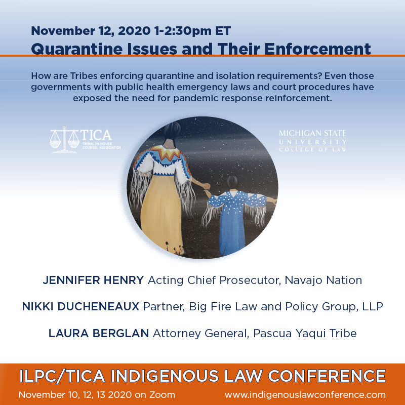 Quarantine Issues and Their Enforcement on Day 2 of the ILPC/TICA Indigenous Law Conference November 6, 2020November 5, 2020Monica Williamson 17th Annual ILPC/TICA Indigenous Law Conference November 10, 12, and 13, 2020 1-4:30pm ET Panel 3: COVID-19 Related Litigation Register and learn more at www.indigenouslawconference.com Click to print (Opens in new window) Print Click to email a link to a friend (Opens in new window) Email Click to share on X (Opens in new window) X Click to share on Facebook (Opens in new window) Facebook More Click to share on Pinterest (Opens in new window) Pinterest Click to share on Tumblr (Opens in new window) Tumblr Click to share on Reddit (Opens in new window) Reddit Like Loading... Related