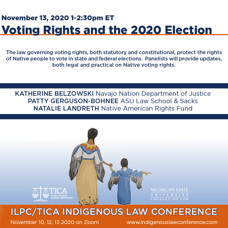 Voting Rights and the 2020 Election: Day 3 of the ILPC/TICA Indigenous Law Conference November 7, 2020November 5, 2020Monica Williamson 17th Annual ILPC/TICA Indigenous Law Conference November 10, 12, and 13, 2020 1-4:30pm ET Panel 5: Voting Rights and the 2020 Election Register and learn more at www.indigenouslawconference.com Click to print (Opens in new window) Print Click to email a link to a friend (Opens in new window) Email Click to share on X (Opens in new window) X Click to share on Facebook (Opens in new window) Facebook More Click to share on Pinterest (Opens in new window) Pinterest Click to share on Tumblr (Opens in new window) Tumblr Click to share on Reddit (Opens in new window) Reddit Like Loading... Related