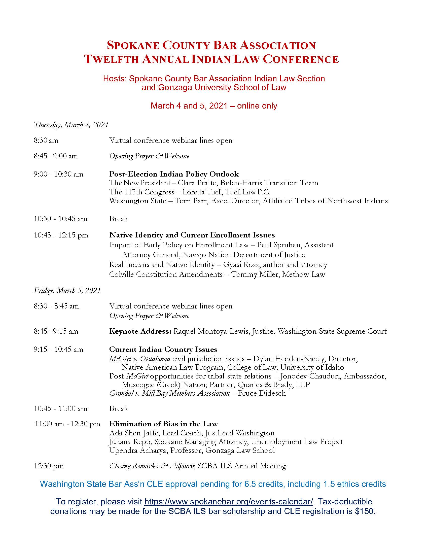 Spokane County Bar Association 12th Annual Indian Law Conference January 13, 2021Matthew L.M. Fletcher Here: 2021-01-12 SCBA ILS CLE agenda Click to print (Opens in new window) Print Click to email a link to a friend (Opens in new window) Email Click to share on X (Opens in new window) X Click to share on Facebook (Opens in new window) Facebook More Click to share on Pinterest (Opens in new window) Pinterest Click to share on Tumblr (Opens in new window) Tumblr Click to share on Reddit (Opens in new window) Reddit Like Loading... Related