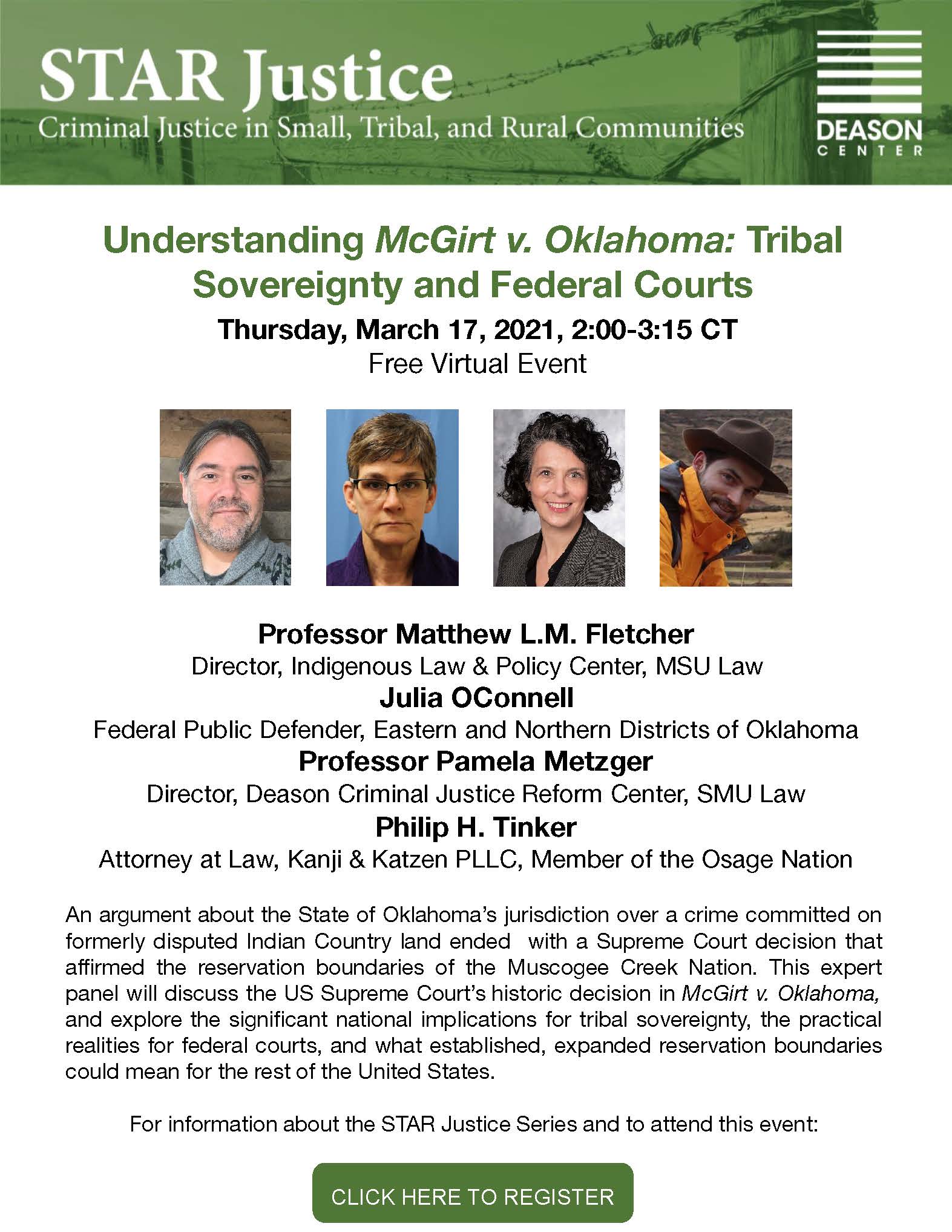 SMU Law STAR Justice Webinar on McGirt — March 16, 2021 March 16, 2021Matthew L.M. Fletcher Register here. Click to print (Opens in new window) Print Click to email a link to a friend (Opens in new window) Email Click to share on X (Opens in new window) X Click to share on Facebook (Opens in new window) Facebook More Click to share on Pinterest (Opens in new window) Pinterest Click to share on Tumblr (Opens in new window) Tumblr Click to share on Reddit (Opens in new window) Reddit Like Loading... Related