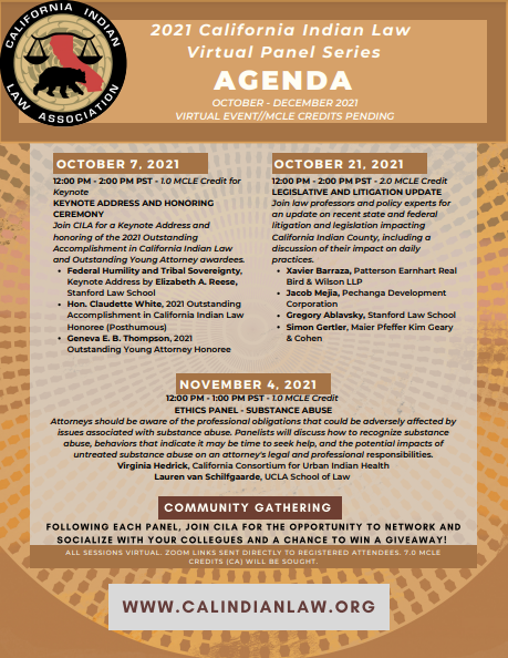 CILA WILL SEEK RETROACTIVE APPROVAL FROM THE CALIFORNIA STATE BAR FOR MCLE CREDIT FOR EACH PAENL. WE WILL SEND CERTIFICATES TO QUALIFYING PARTICIPANTS UPON APPROVAL BY THE STATE BAR. CILA CANNOT GUARANTEE THAT APPROVAL FROM THE CALIFORNIA STATE BAR FOR MCLE CREDIT WILL OCCUR BEFORE THE FEB. 1, 2022 REPORTING DEADLINE.