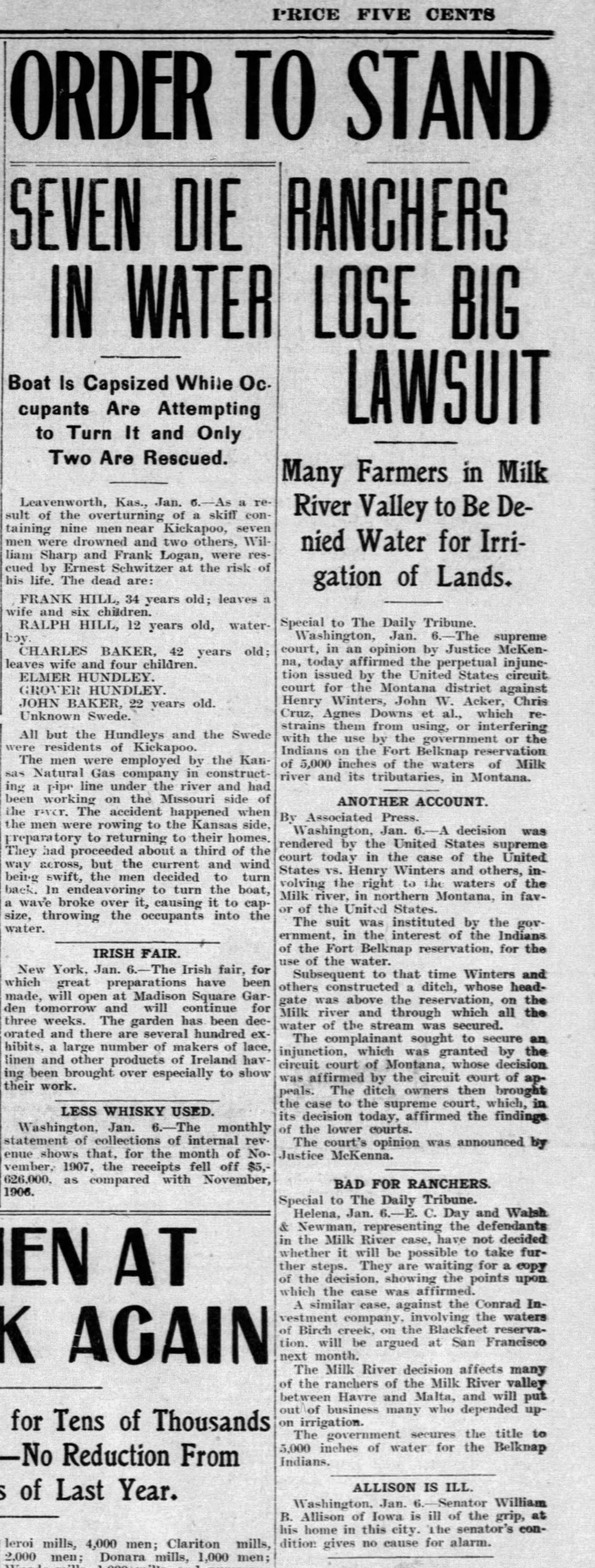 Winters Rights Today in Federal Indian Law Class November 15, 2021Matthew L.M. Fletcher Havre Herald 2/15/1907 Havre Herald 7/1/1908 Click to print (Opens in new window) Print Click to email a link to a friend (Opens in new window) Email Click to share on X (Opens in new window) X Click to share on Facebook (Opens in new window) Facebook More Click to share on Pinterest (Opens in new window) Pinterest Click to share on Tumblr (Opens in new window) Tumblr Click to share on Reddit (Opens in new window) Reddit Like Loading... Related