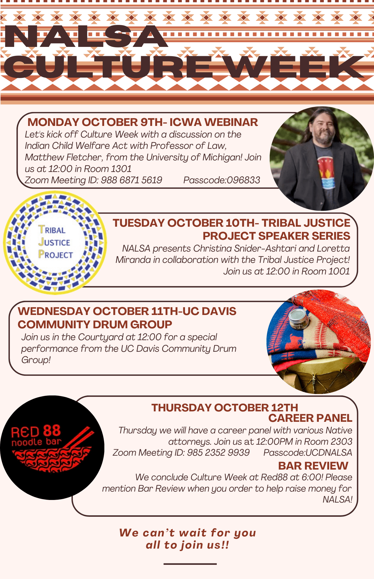 UC Davis NALSA Culture Week Events October 9, 2023Matthew L.M. Fletcher Click to print (Opens in new window) Print Click to email a link to a friend (Opens in new window) Email Click to share on X (Opens in new window) X Click to share on Facebook (Opens in new window) Facebook More Click to share on Pinterest (Opens in new window) Pinterest Click to share on Tumblr (Opens in new window) Tumblr Click to share on Reddit (Opens in new window) Reddit Like Loading... Related