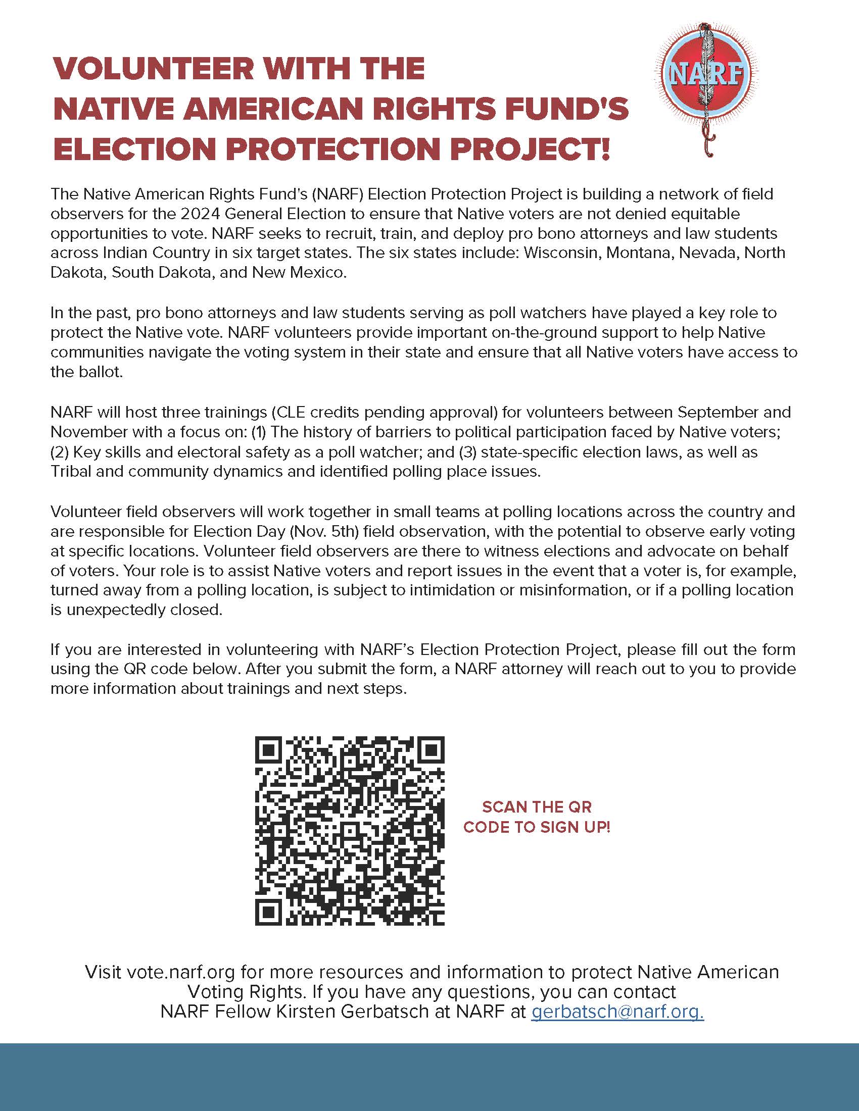 Volunteer with the Native American Rights Fund’s Election Protection Project September 12, 2024Matthew Campbell You can learn more about protecting the Native vote at https://vote.narf.org/ Click to print (Opens in new window) Print Click to email a link to a friend (Opens in new window) Email Click to share on X (Opens in new window) X Click to share on Facebook (Opens in new window) Facebook More Click to share on Pinterest (Opens in new window) Pinterest Click to share on Tumblr (Opens in new window) Tumblr Click to share on Reddit (Opens in new window) Reddit Like Loading... Related