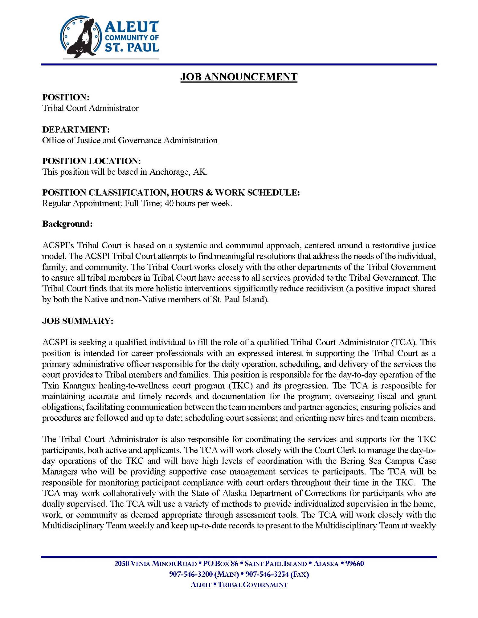 This position is intended for career professionals with an expressed interest in supporting the Tribal Court as a primary administrative officer responsible for the daily operation, scheduling, and delivery of the services the court provides to Tribal members and families. This position is responsible for the day-to-day operation of the Txin Kaangux healing-to-wellness court program (TKC) and its progression. The TCA is responsible for maintaining accurate and timely records and documentation for the program; overseeing fiscal and grant obligations; facilitating communication between the team members and partner agencies; ensuring policies and procedures are followed and up to date; scheduling court sessions; and orienting new hires and team members.
