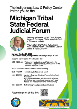 The Indigenous Law & Policy Center is honored to host this year’s Michigan Tribal State Federal Judicial Forum. The open sessions will be held on Monday, October 27th in the Castle Board Room, Rm 343 in the MSU College of Law.
