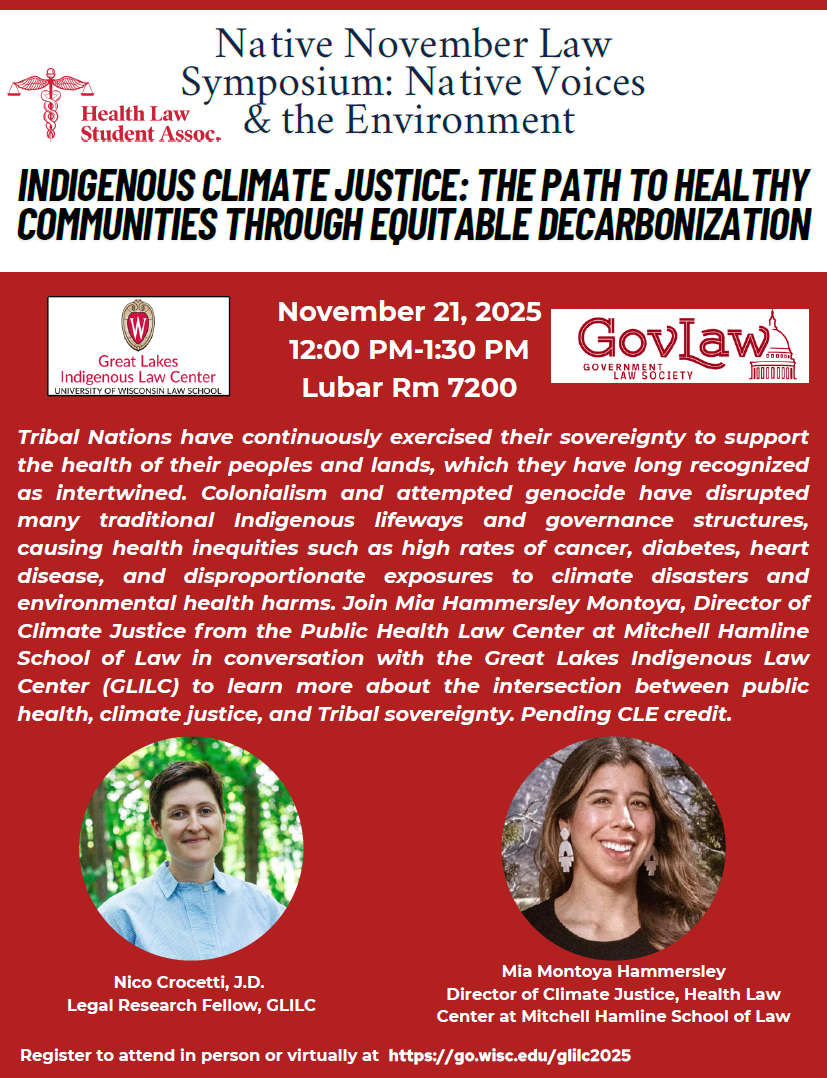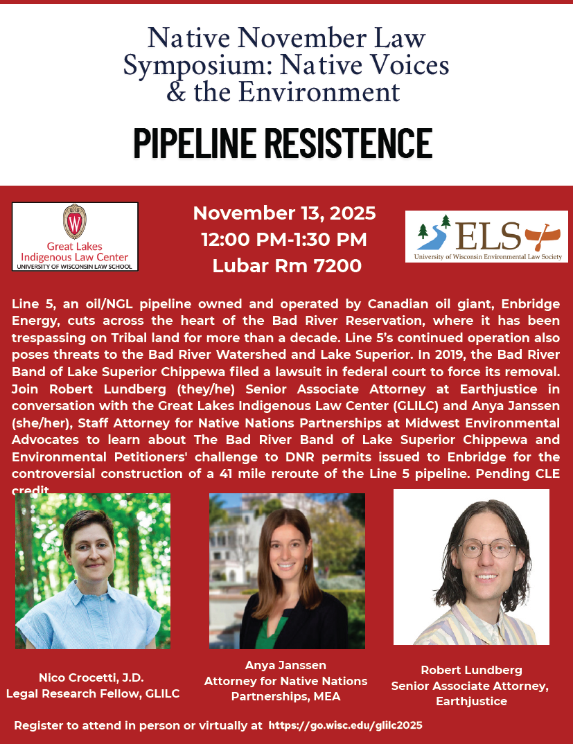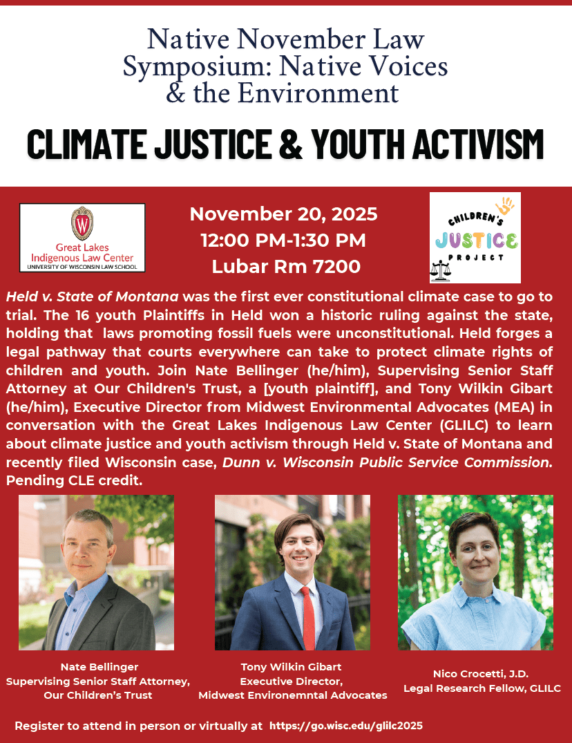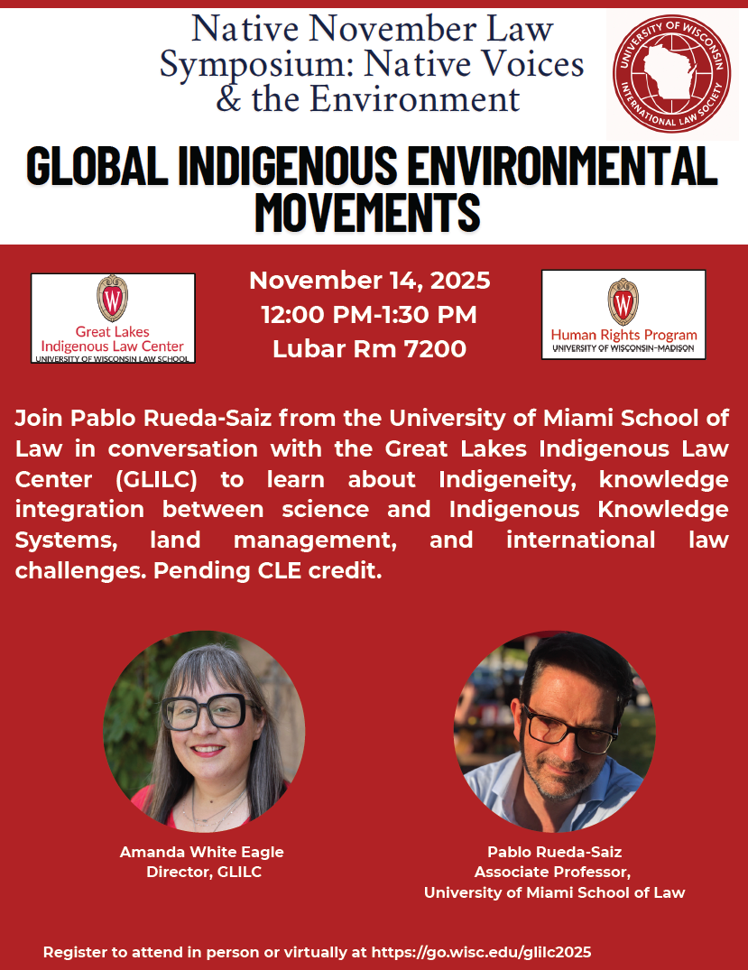 Great Lakes Indigenous Law Center (U.Wis.) November Symposium: “Native Voices & the Environment” November 10, 2025Matthew L.M. Fletcher Click to print (Opens in new window) Print Click to email a link to a friend (Opens in new window) Email Click to share on X (Opens in new window) X Click to share on Facebook (Opens in new window) Facebook More Click to share on Pinterest (Opens in new window) Pinterest Click to share on Tumblr (Opens in new window) Tumblr Click to share on Reddit (Opens in new window) Reddit Like Loading... Related