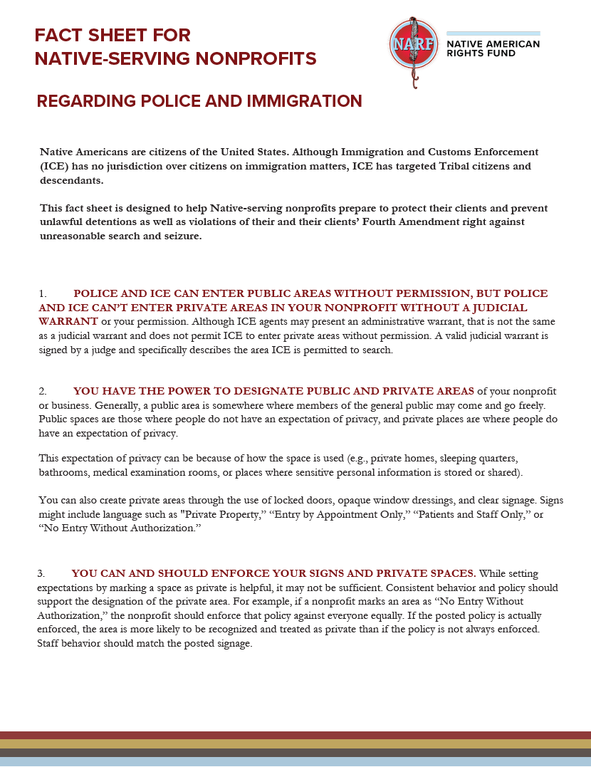 Native American Rights Fund: Resources for Individuals and Non-Profits Approached by ICE January 15, 2026Matthew L.M. Fletcher Details and relevant links here. Print (Opens in new window) Print Email a link to a friend (Opens in new window) Email Share on X (Opens in new window) X Share on Facebook (Opens in new window) Facebook More Share on Pinterest (Opens in new window) Pinterest Share on Tumblr (Opens in new window) Tumblr Share on Reddit (Opens in new window) Reddit Like Loading... Related