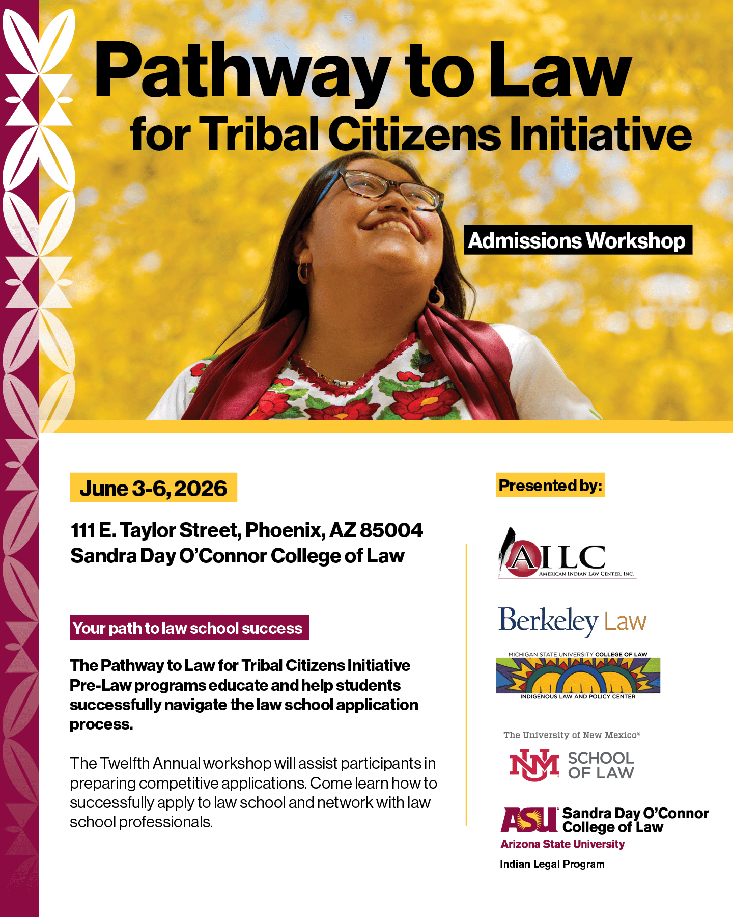 This year’s Pathway to Law for Tribal Citizens Workshop will be held at the ASU Sandra Day O’Connor College of Law on June 3–6, 2026.