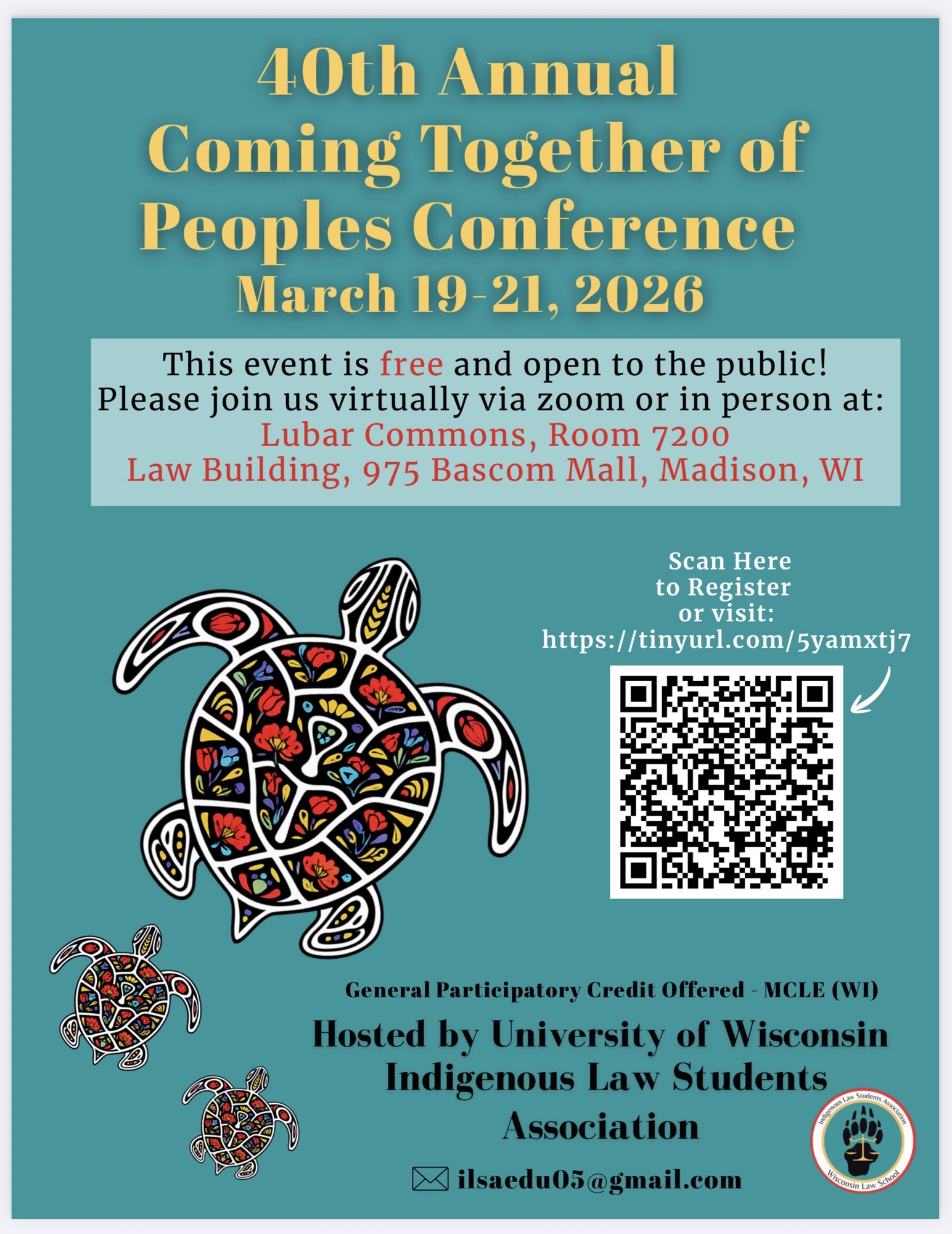40th Annual Coming Together of Peoples Conference, March 19-21, 2026 @ UWisconsin Law School February 23, 2026Matthew L.M. Fletcher Print (Opens in new window) Print Email a link to a friend (Opens in new window) Email Share on X (Opens in new window) X Share on Facebook (Opens in new window) Facebook More Share on Pinterest (Opens in new window) Pinterest Share on Tumblr (Opens in new window) Tumblr Share on Reddit (Opens in new window) Reddit Like Loading... Related