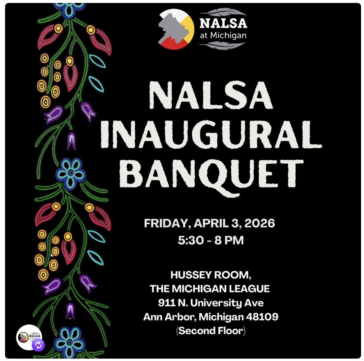 Hainipi, Boozhoo, Aaniin, Chokma, Yá’át’ééh, Imaynallan, Mohtompan wunne, Posoh, ᎣᏏᏲ, Lios em chaniavu, Ske:g taş: Greetings from the Native American Law Students Association (NALSA) at Michigan Law! Please join us for our inaugural NALSA Banquet to celebrate Indigeneity and be in community.