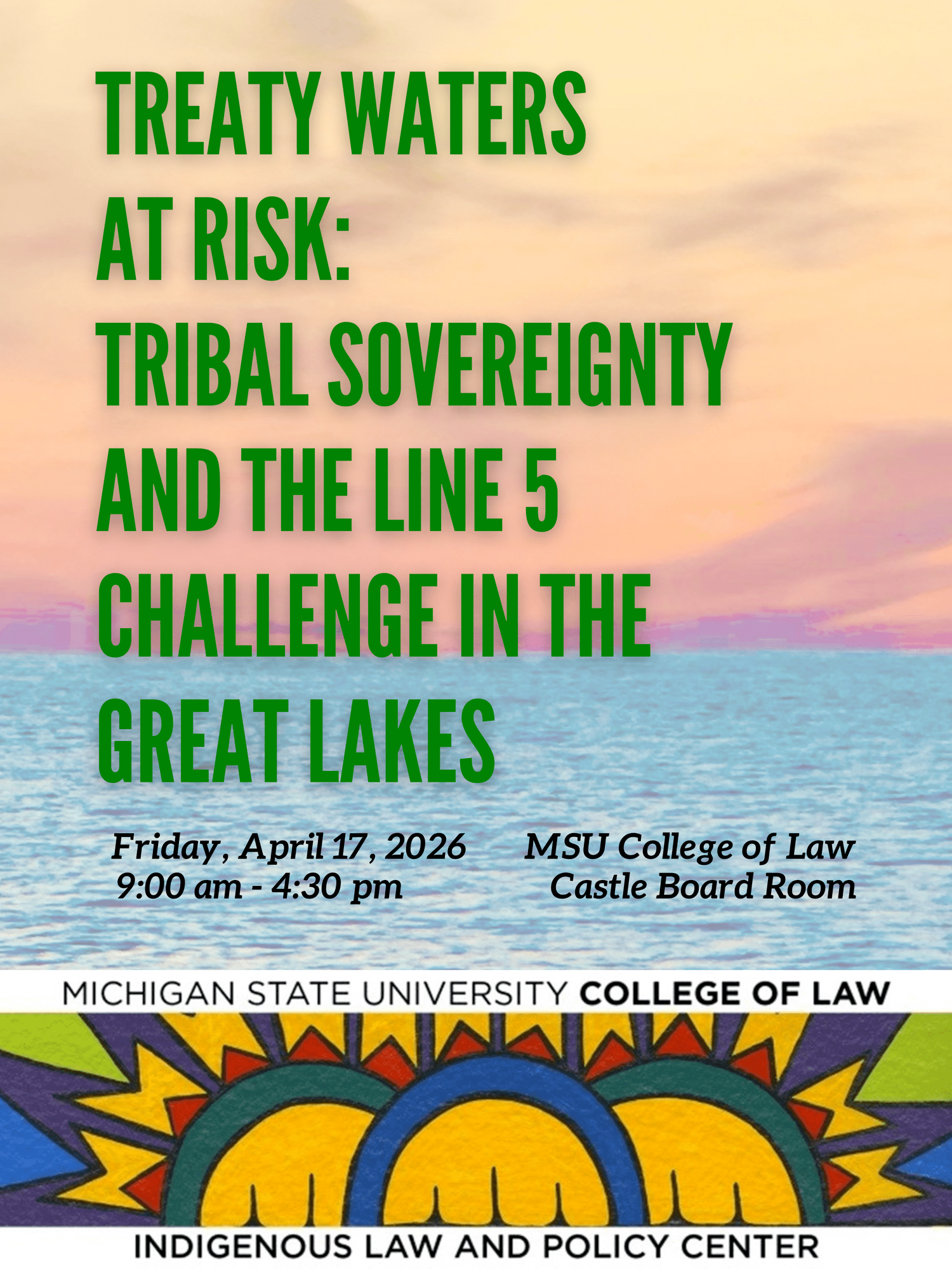 Join us at MSU Law for Treaty Waters at Risk: Tribal Sovereignty and the Line 5 Challenge in the Great Lakes, a one-day conference on Friday, April 17, 2026, examining the legal and environmental stakes of energy infrastructure in treaty-protected waters.