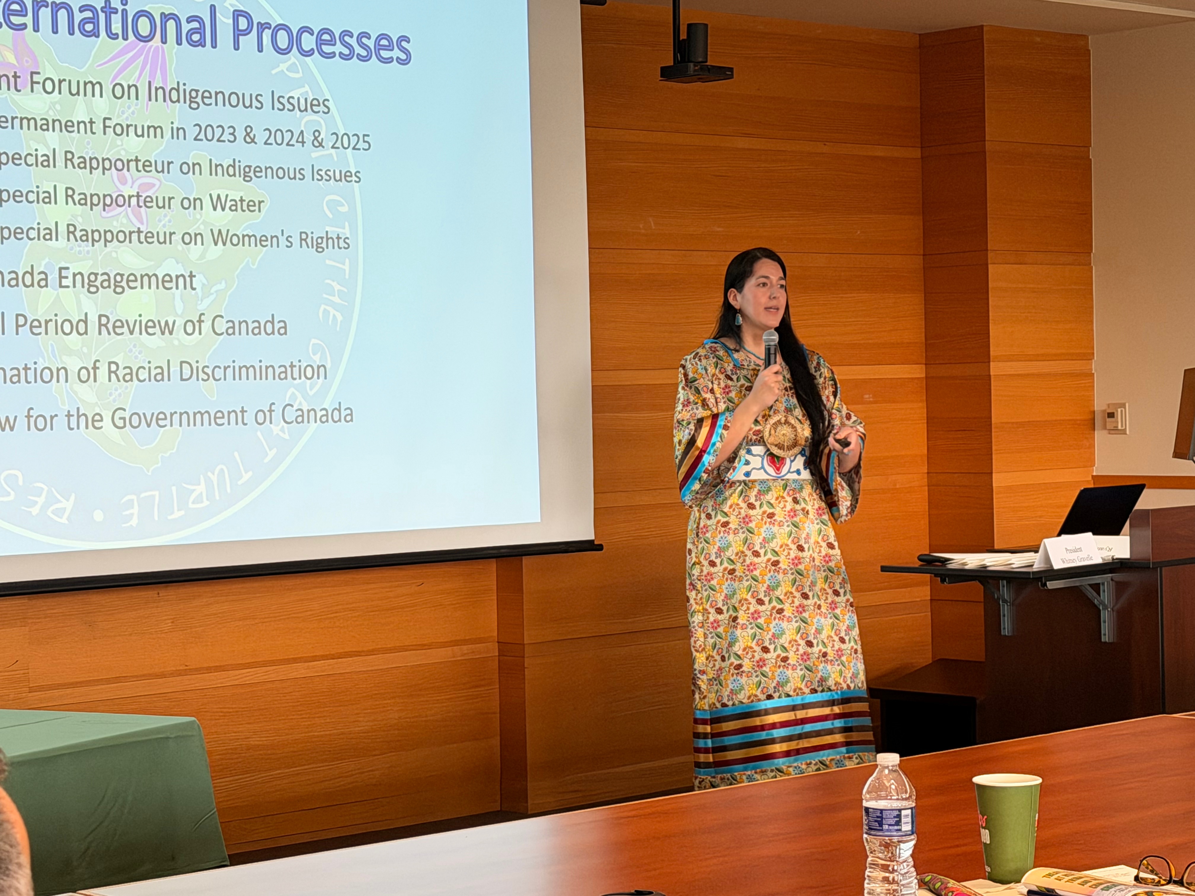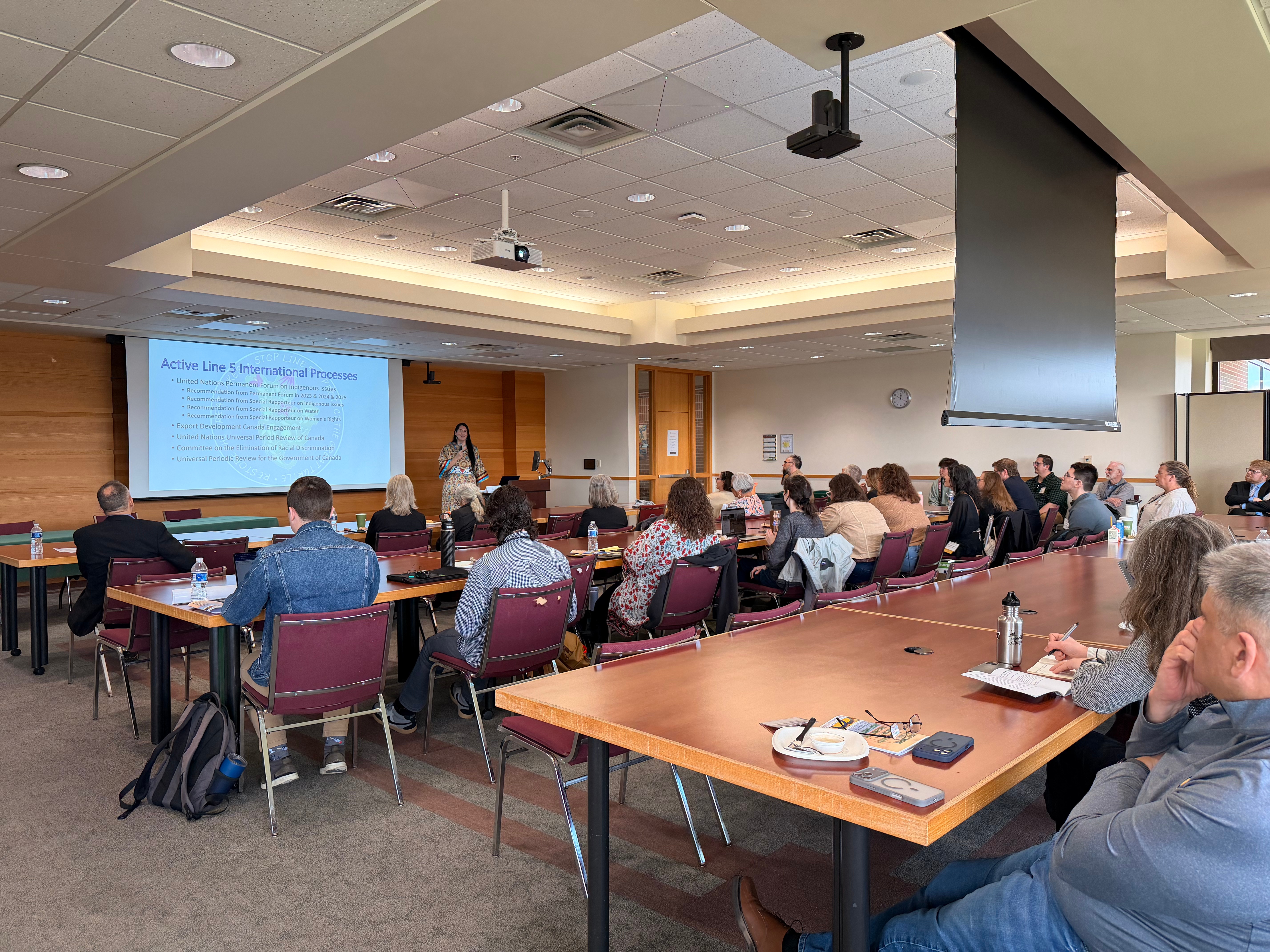 President Whitney Gravelle, Bay Mills Indian Community delivering her keynote address “The Battle of the Black Snake: Line 5 and Tribal Treaty Rights” at the Treaty Waters At Risk: Tribal Sovereignty and the Line 5 Challenge in the Great Lakes conference. Held at the MSU College of Law’s Castle Board Room, East Lansing, MI. Several panelists today offering a wealth of information. There’s still time left to join us for the afternoon panels!