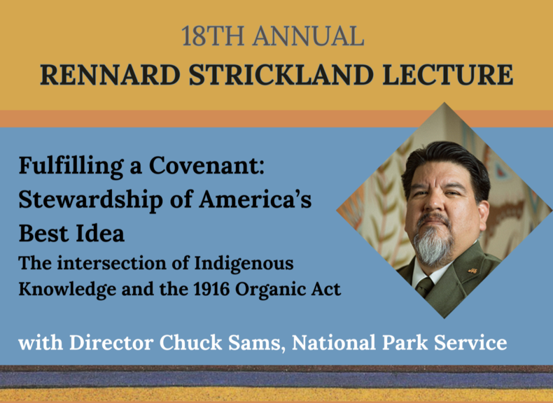 This year’s lecture will feature Mr. Charles F. “Chuck” Sams III (Cayuse and Walla Walla), the Director of the National Park Service, with his talk, “Fulfilling a Covenant: Stewardship of America’s Best Idea — The intersection of Indigenous Knowledge and the 1916 Organic Act.”