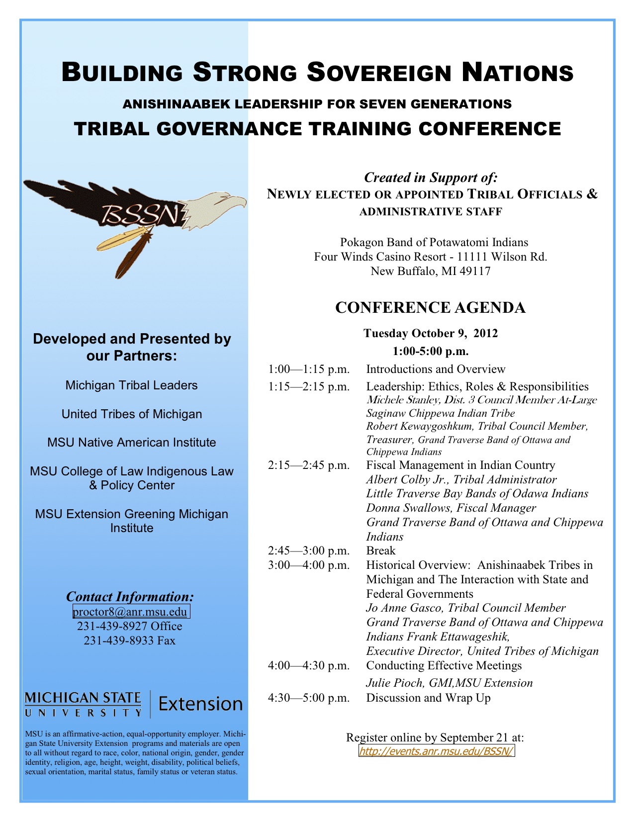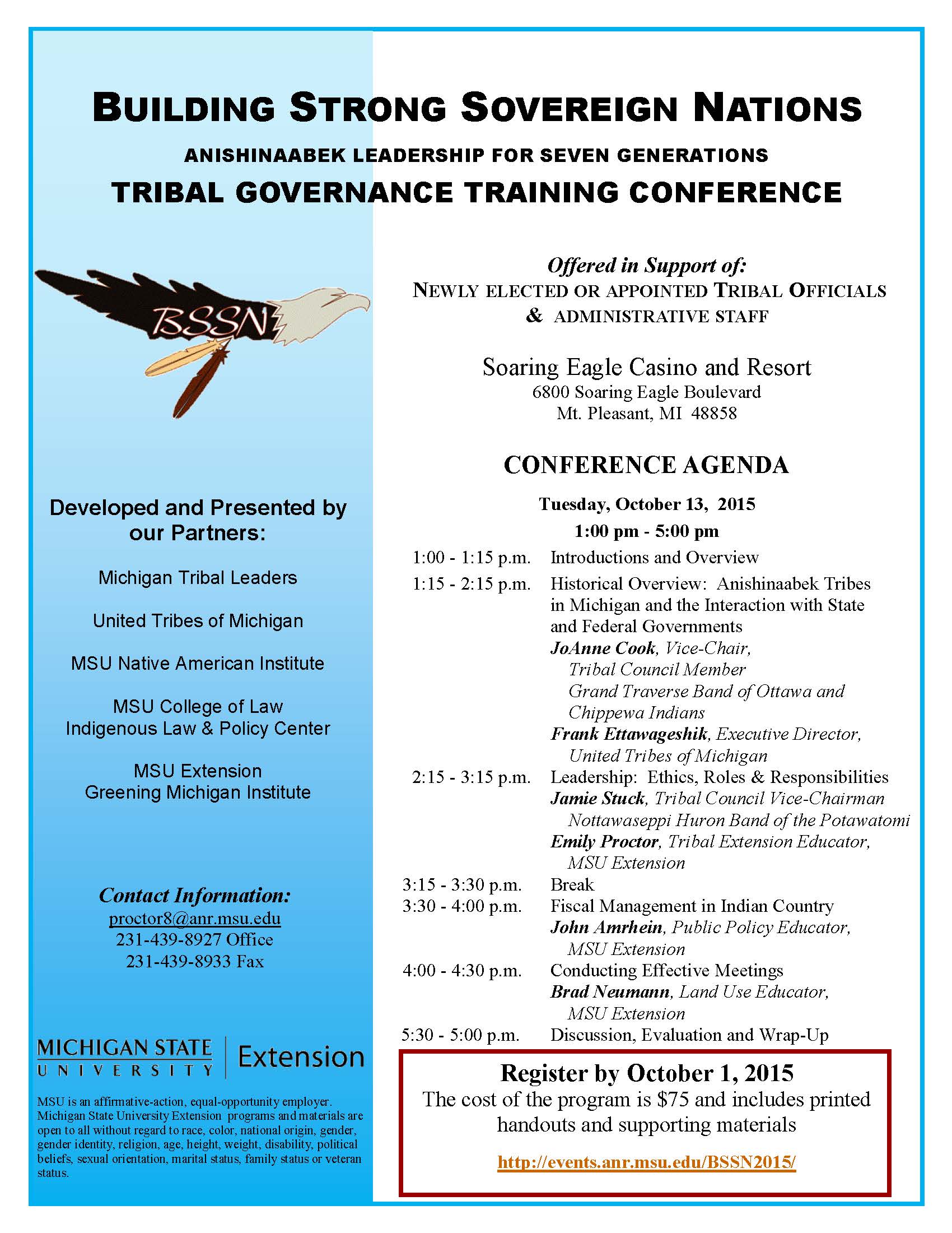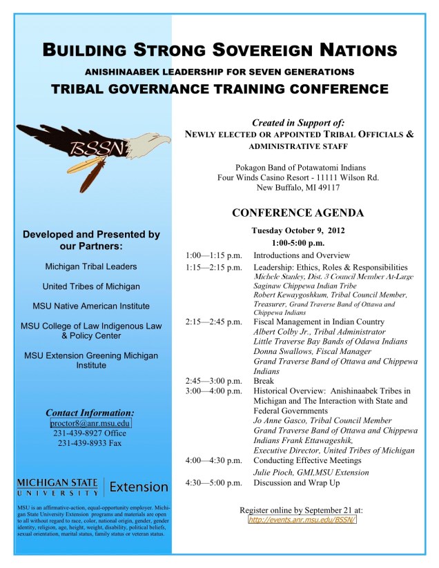 The Building Strong Sovereign Nations Tribal Governance Training Conference is quickly approaching. It’s happening on May 19th and 20th at the Odawa Casino Resort in Petoskey. Here’s a link to the registration page.