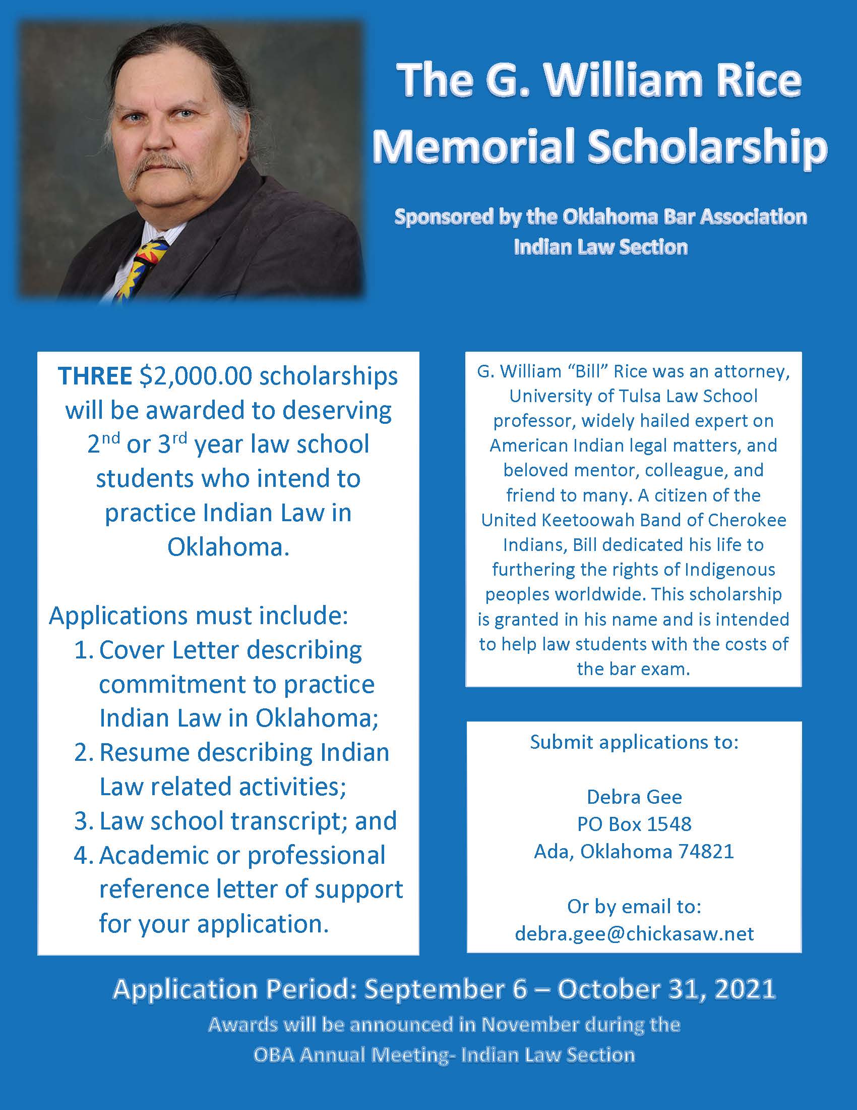 THREE $2,000.00 scholarships will be awarded to deserving second or third year law school students who intend to practice Indian Law in Oklahoma.