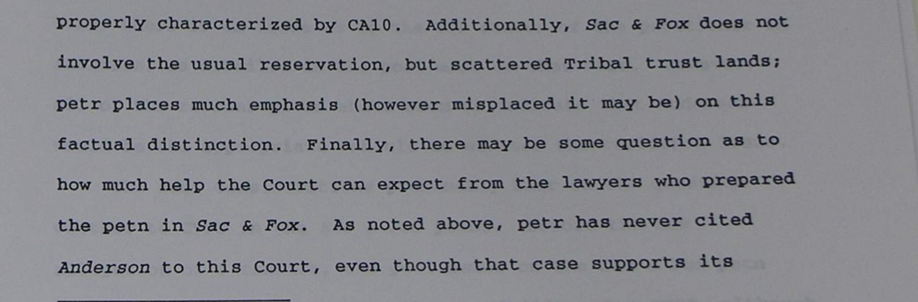On the really good side, SOC wrote the majority opinion in Oklahoma Tax Commission v. Sac and Fox Nation. That decision, of course, was due in large part to Bill Rice’s brilliance, but perhaps also to the underwhelming performance of the OTC’s counsel: