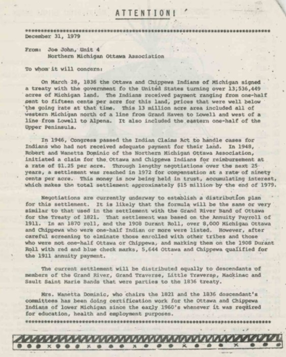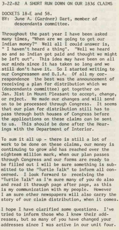 The Michigan Indian Land Claims Settlement Act of 1997 took some time to get past Congress after the Indian Claims Commission judgment came out in 1972. Here is some of that history told in the pages of the original Turtle Talk newsletter and its precursor, Indian Talk of Southern Michigan.