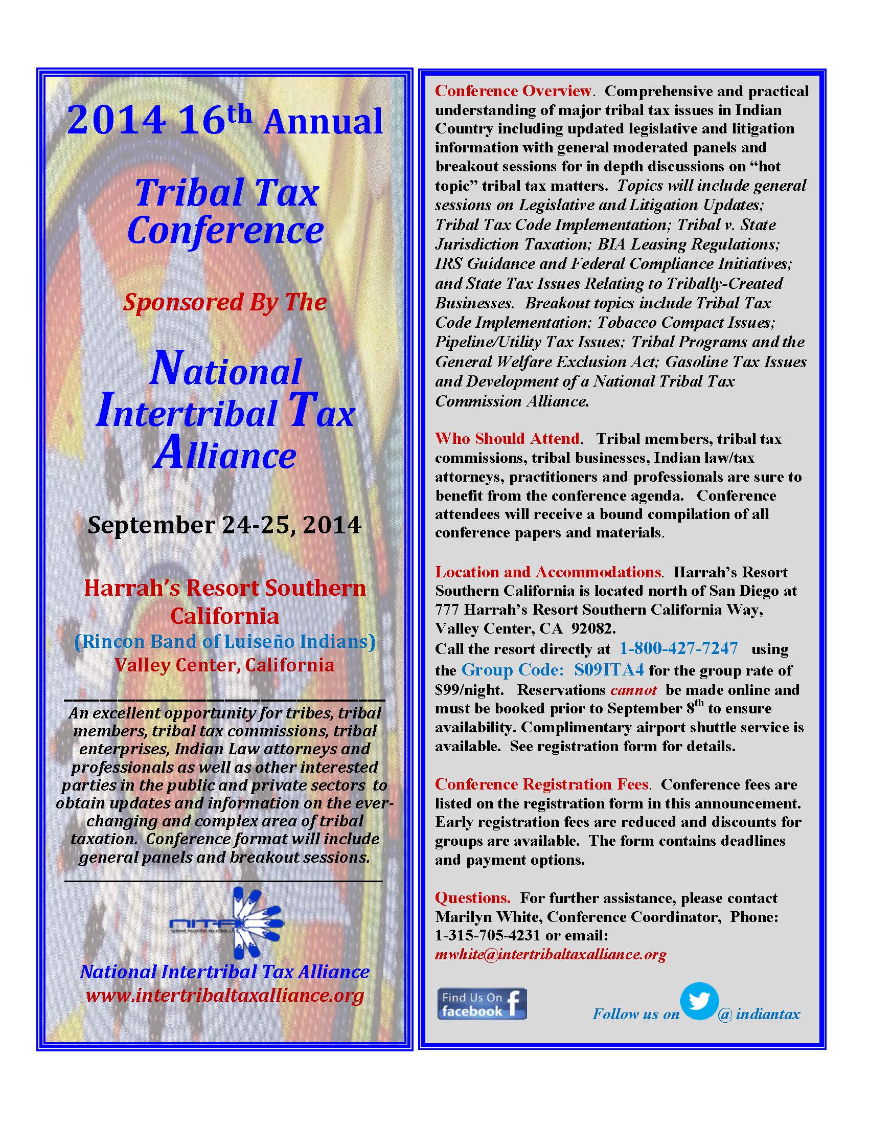 AKWESASNE, NY August 8, 2014— The National Intertribal Tax Alliance (NITA) announces its 16th Annual conference to be held September 24-25, 2014 at the Harrah’s Resort Southern California owned by the Rincon Band of Luiseño Indians. NITA is the foremost Native organization focusing on tribal taxation issues for tribal governments and tribal enterprises. NITA’s annual conferences attract many tribal tax commissioners, attorneys and other professionals interested in obtaining the latest updates on tribal tax issues.