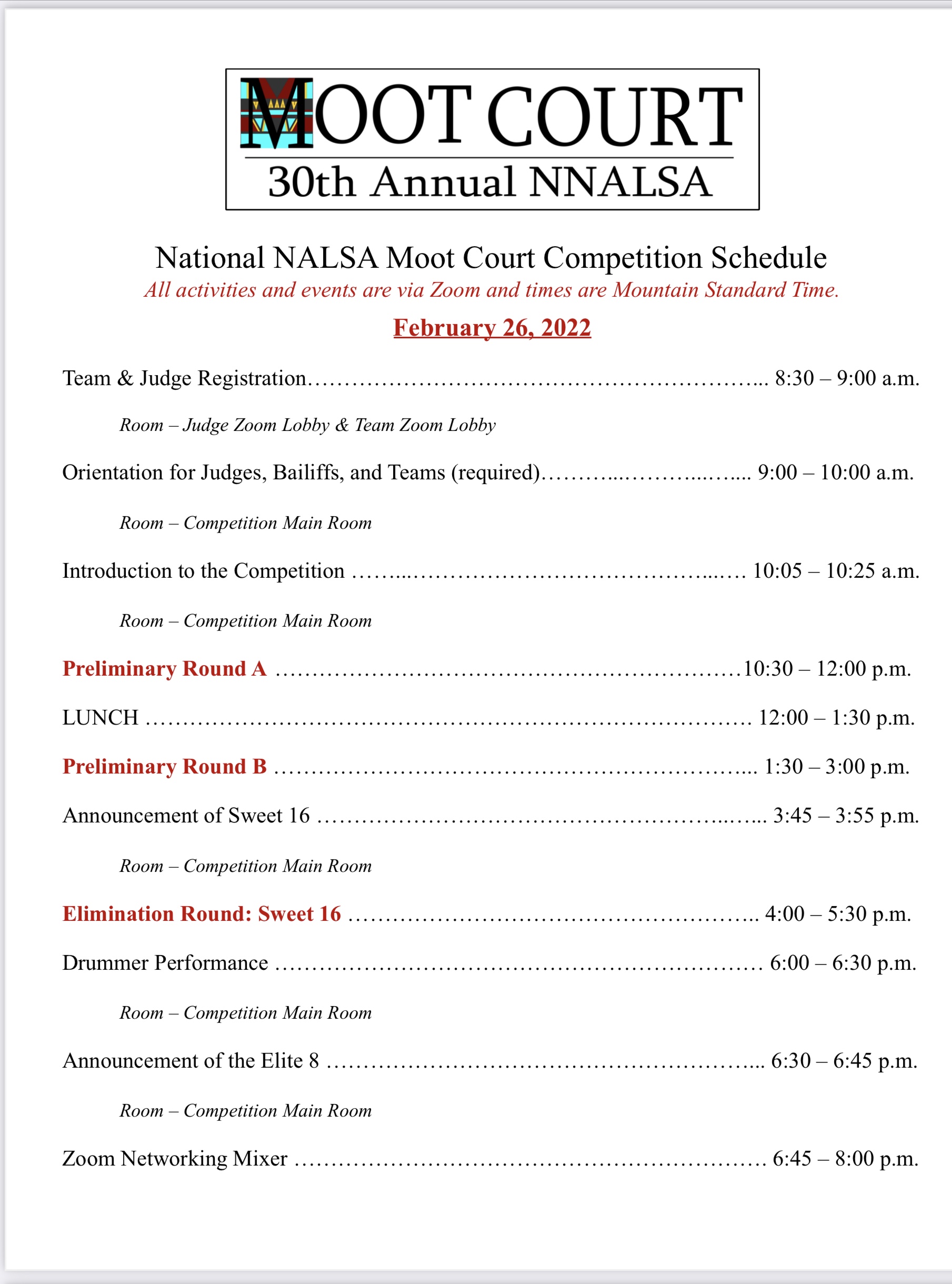 The competition is designed to simulate the practice of law. The annual event requires competing law students, in 2-person teams, to conduct research and write legal briefs, without assistance from professors or others, and argue against other student teams at the competition. The National NALSA Moot Court Competition is the largest National Moot Court Competition that focuses on Native American issues. This year, we have 60 teams competing from 24 law schools.
