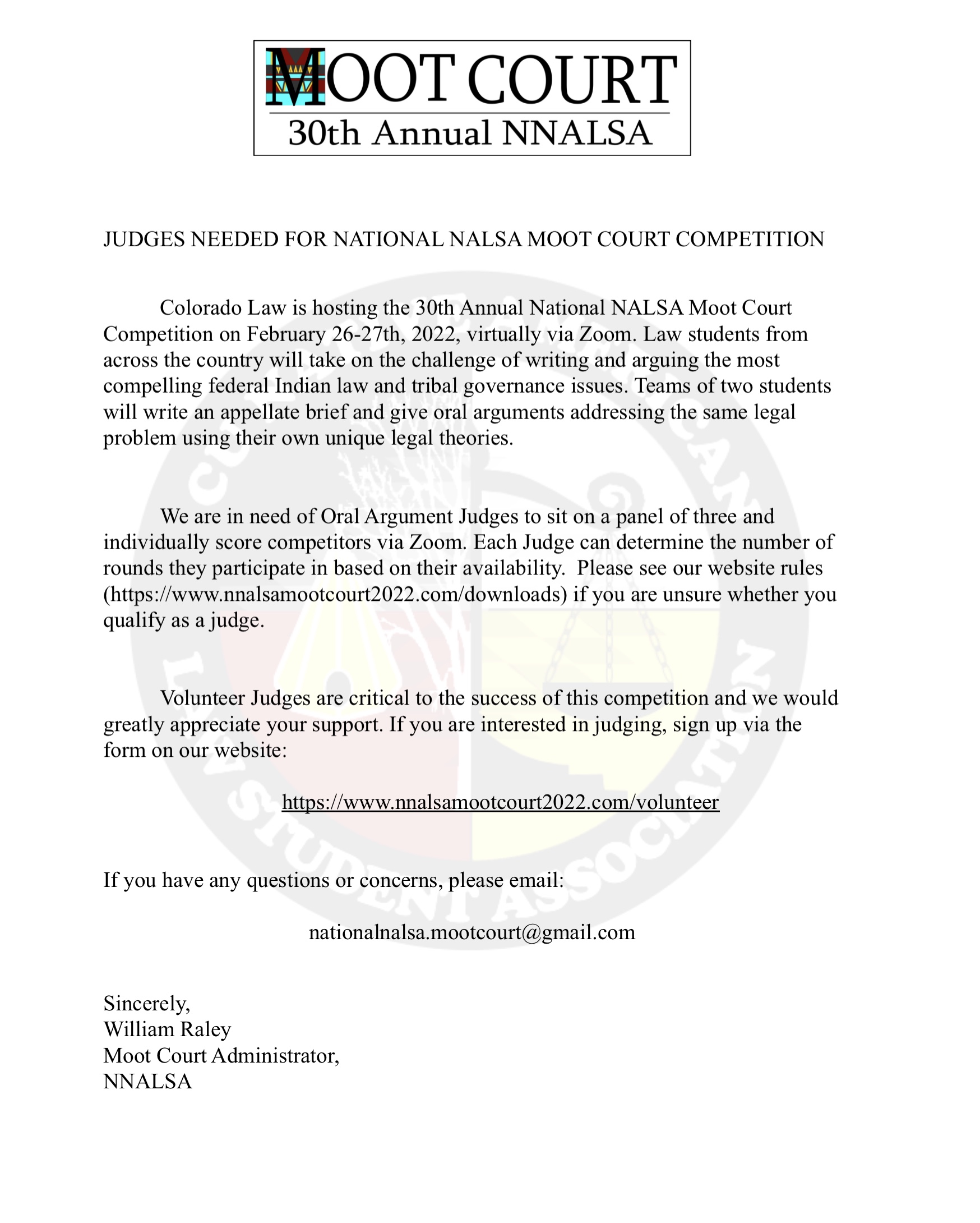 Lewis & Clark Law School is hosting the National NALSA Moot Court Competition (http://nationalnalsa.org/events/mootcourt/)(http://law.lclark.edu/student_groups/nalsa/moot_court/) this spring and we are in need of volunteers to be “judges” during the competition.