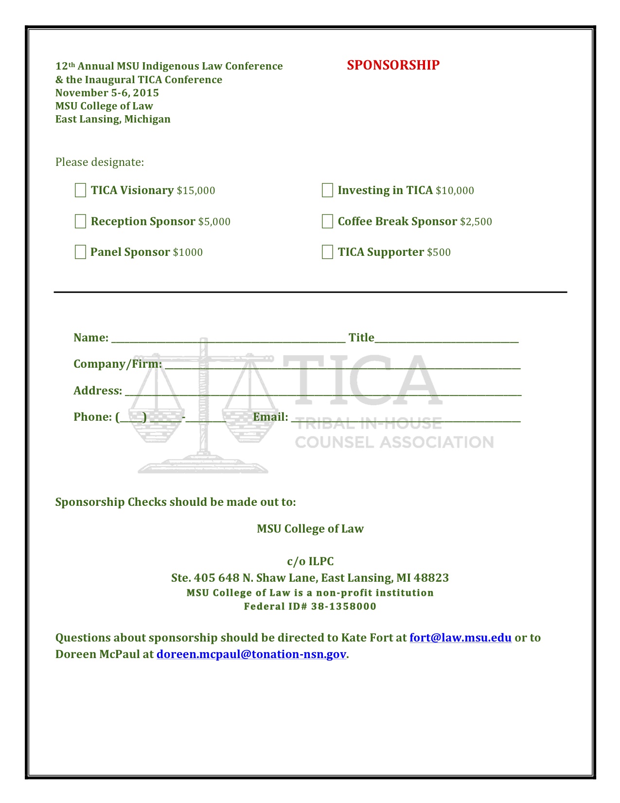 Registration includes TICA membership, continental breakfast and lunch both days along with the reception Thursday night at the East Lansing Marriott. We’ve also applied for 11.25 CLEs from the Minnesota State Bar Association, and will provide forms for those seeking credits in other states.